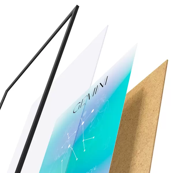 El póster consta de marco, plexiglás, imagen impresa y soporte de aglomerado. El póster puede colgarse inmediatamente en la pared gracias a los soportes de la parte posterior.