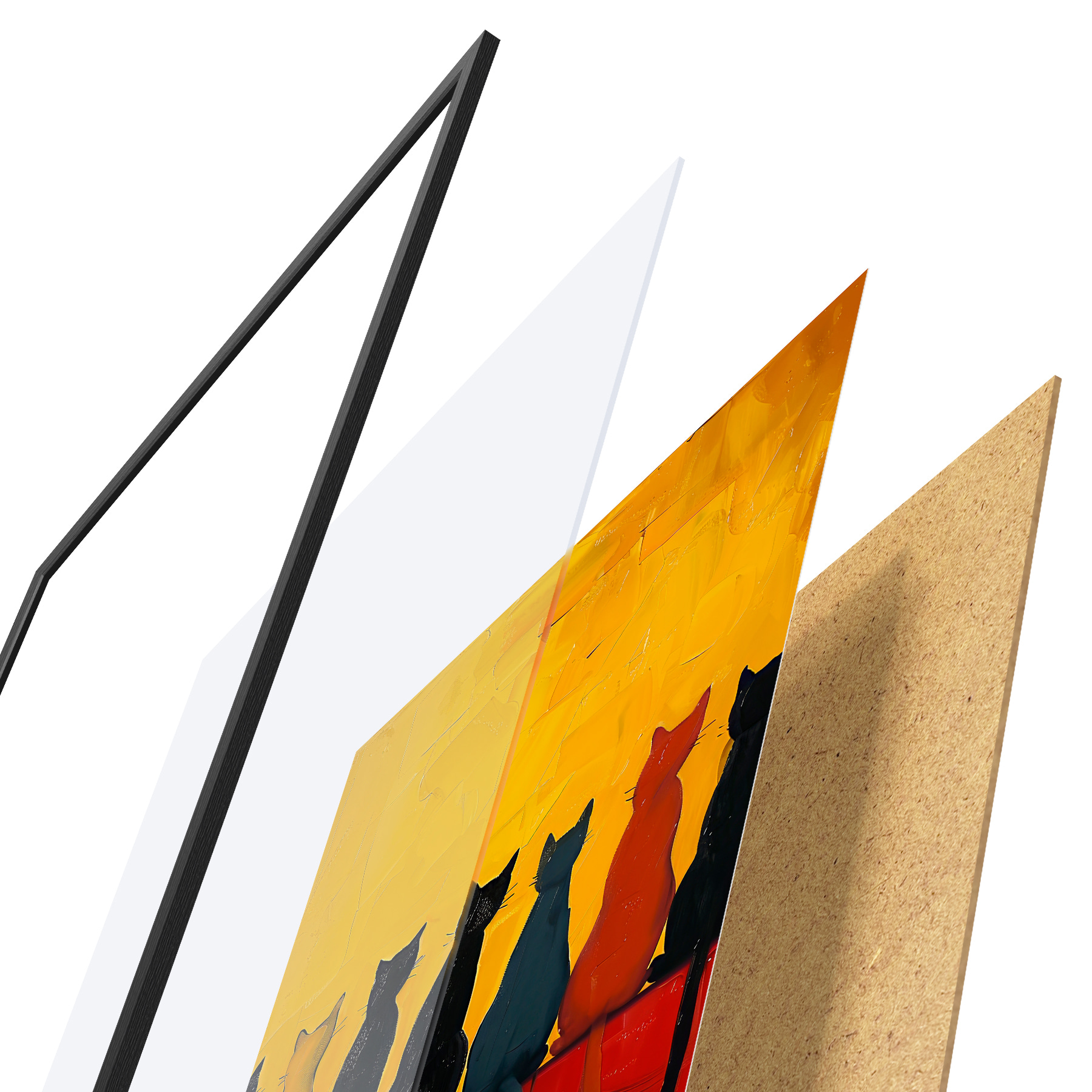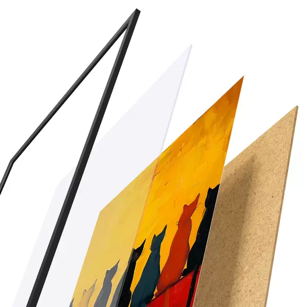El póster consta de marco, plexiglás, imagen impresa y soporte de aglomerado. El póster puede colgarse inmediatamente en la pared gracias a los soportes de la parte posterior.