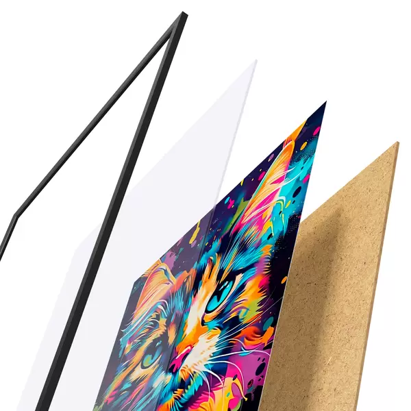 El póster consta de marco, plexiglás, imagen impresa y soporte de aglomerado. El póster puede colgarse inmediatamente en la pared gracias a los soportes de la parte posterior.