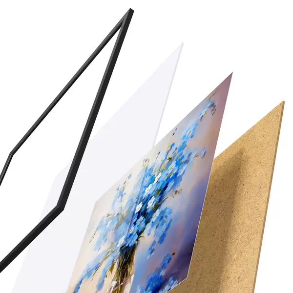 El póster consta de marco, plexiglás, imagen impresa y soporte de aglomerado. El póster puede colgarse inmediatamente en la pared gracias a los soportes de la parte posterior.