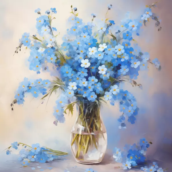 Poster Ramo de flores silvestres azules en una jarra de vidrio pintura al óleo Nr f39331