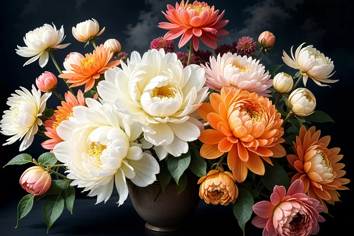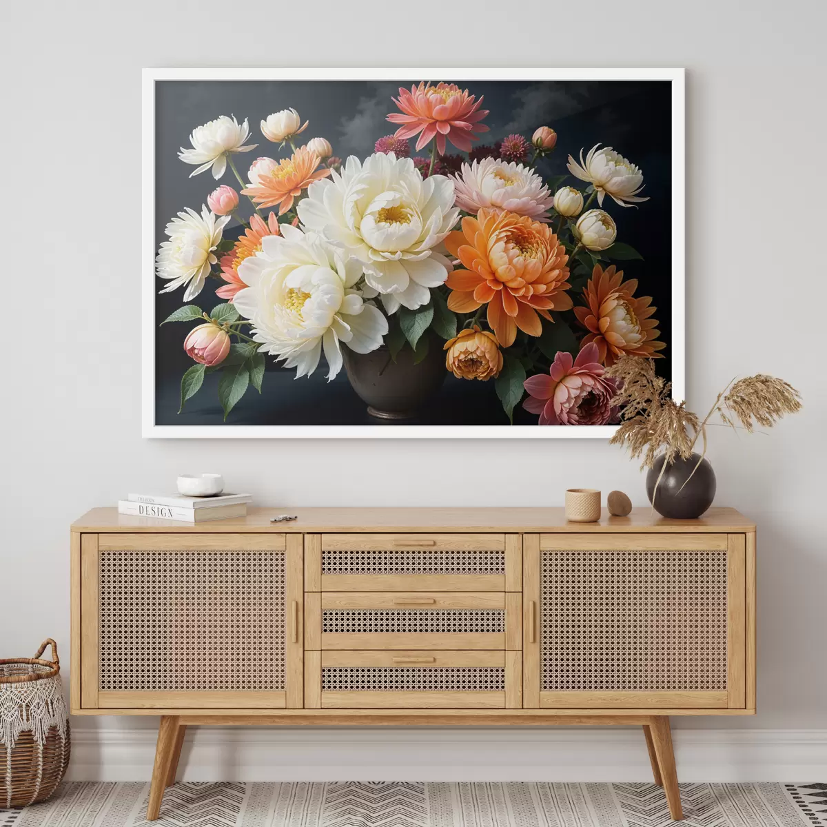 Poster Un ramo de vibrantes flores de dalia en varios colores sobre un fondo oscuro Nr f39399