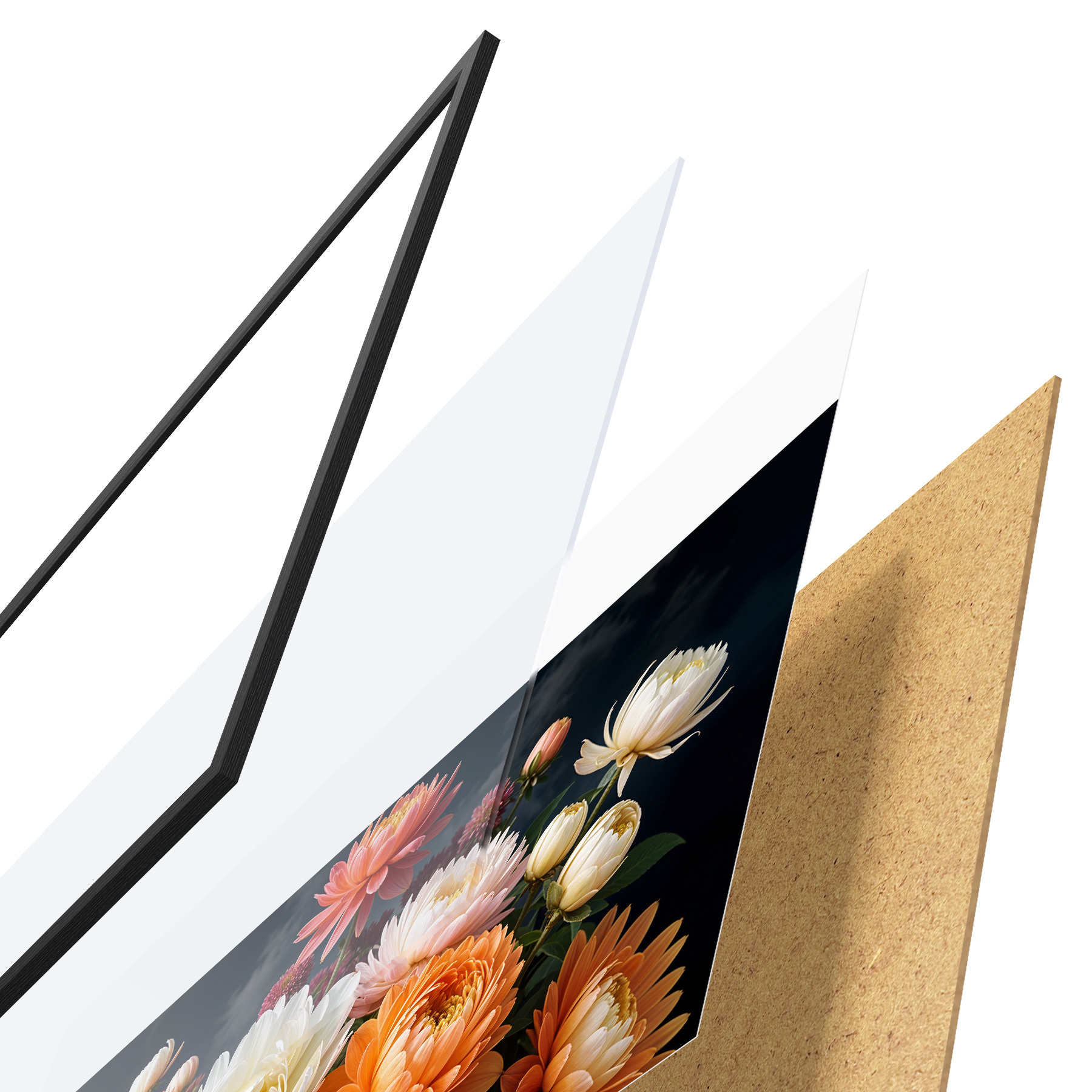 El póster consta de marco, plexiglás, imagen impresa y soporte de aglomerado. El póster puede colgarse inmediatamente en la pared gracias a los soportes de la parte posterior.