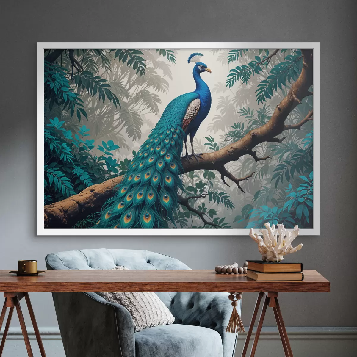 Poster Un pavo real azul vibrante posado en la rama de un árbol en un exuberante bosque tropical f39401