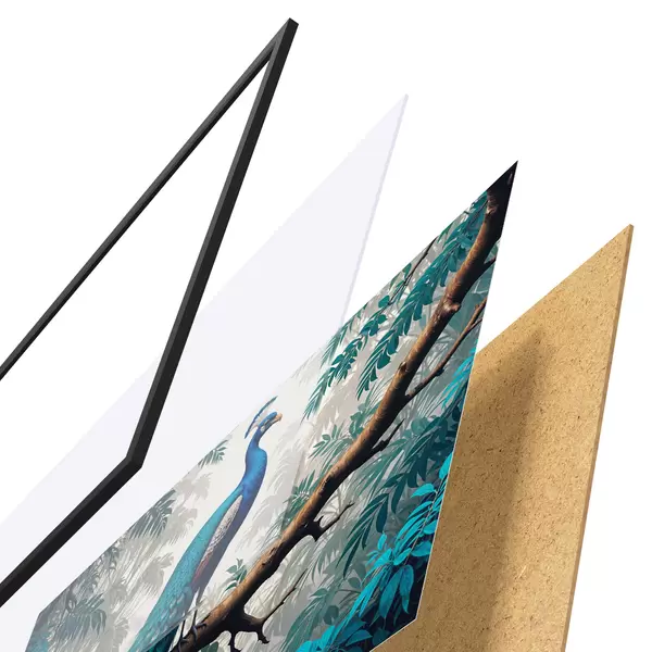 El póster consta de marco, plexiglás, imagen impresa y soporte de aglomerado. El póster puede colgarse inmediatamente en la pared gracias a los soportes de la parte posterior.