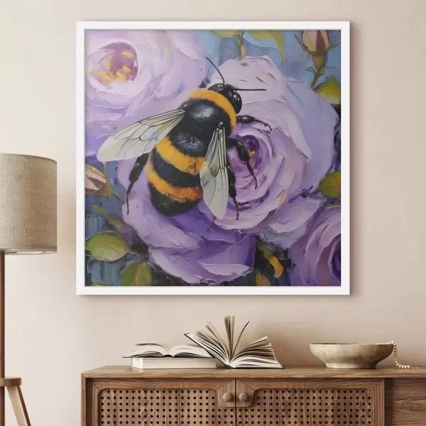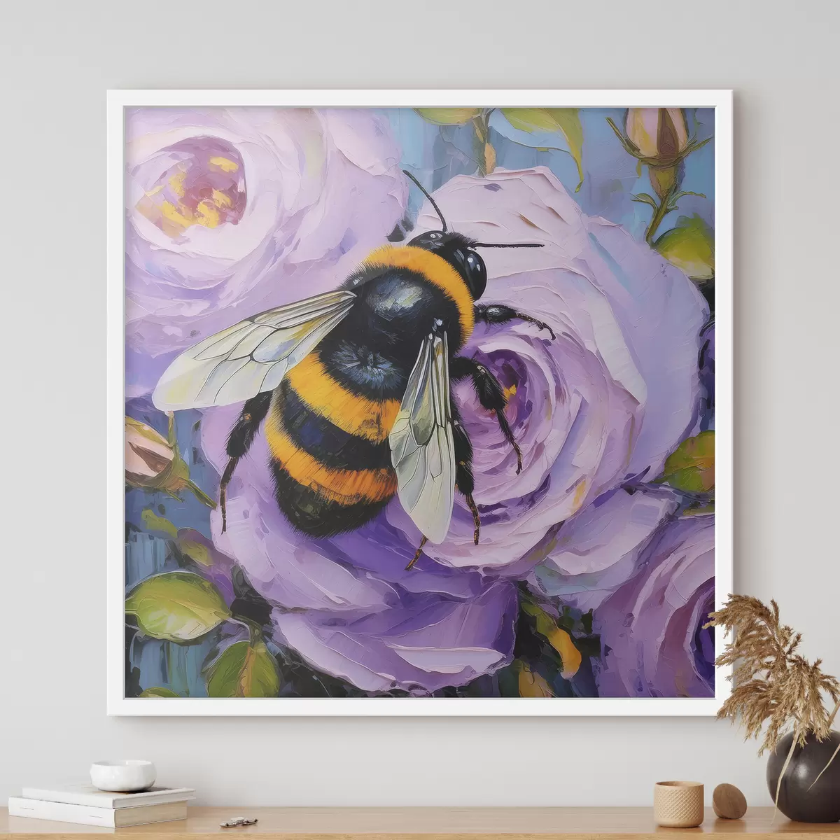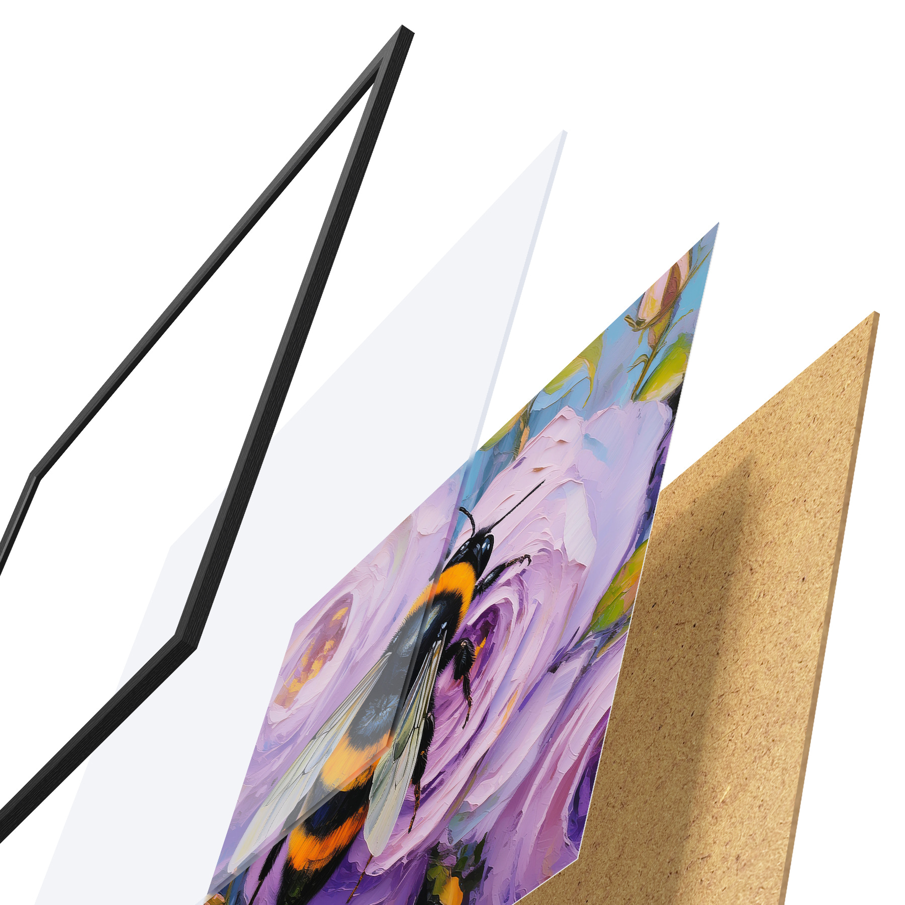 Poster Abeja sobre peonias rosas, flores de verano, pintura al óleo, pinceladas vivas f39410