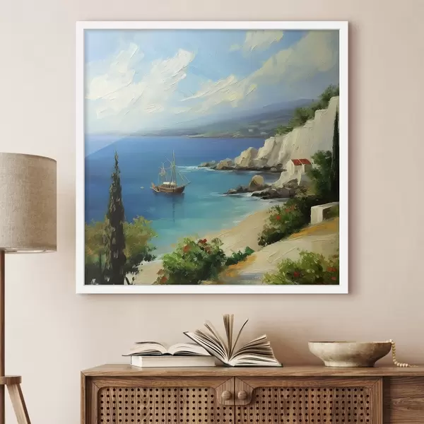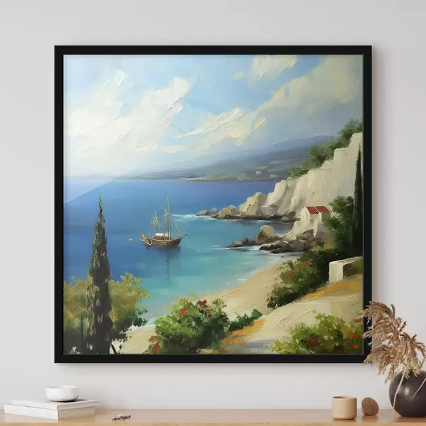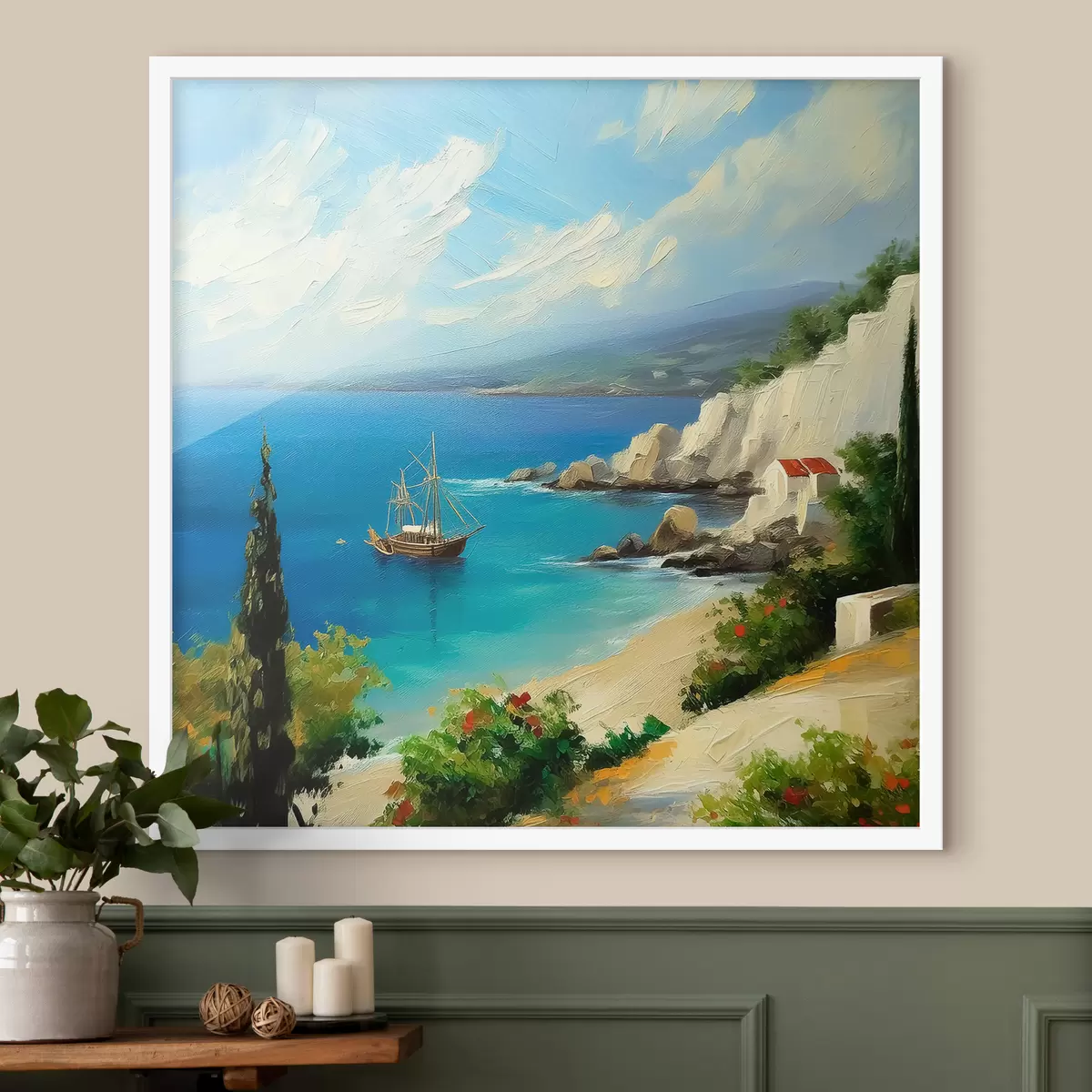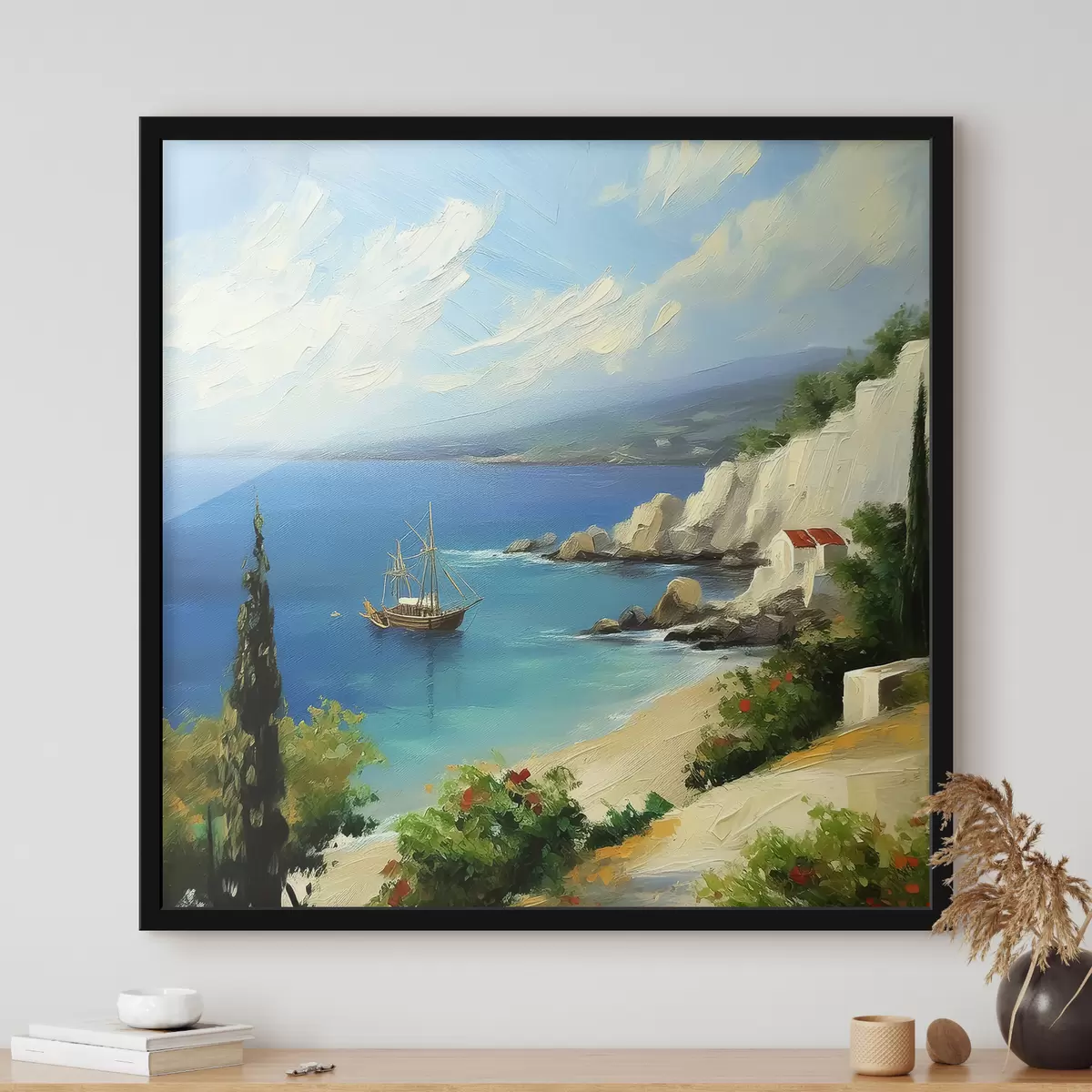 Poster Costa del mar de Grecia, barco, agua azul, pintura al óleo, naturaleza de verano, rocas, pinceladas vívidas Nr f39425