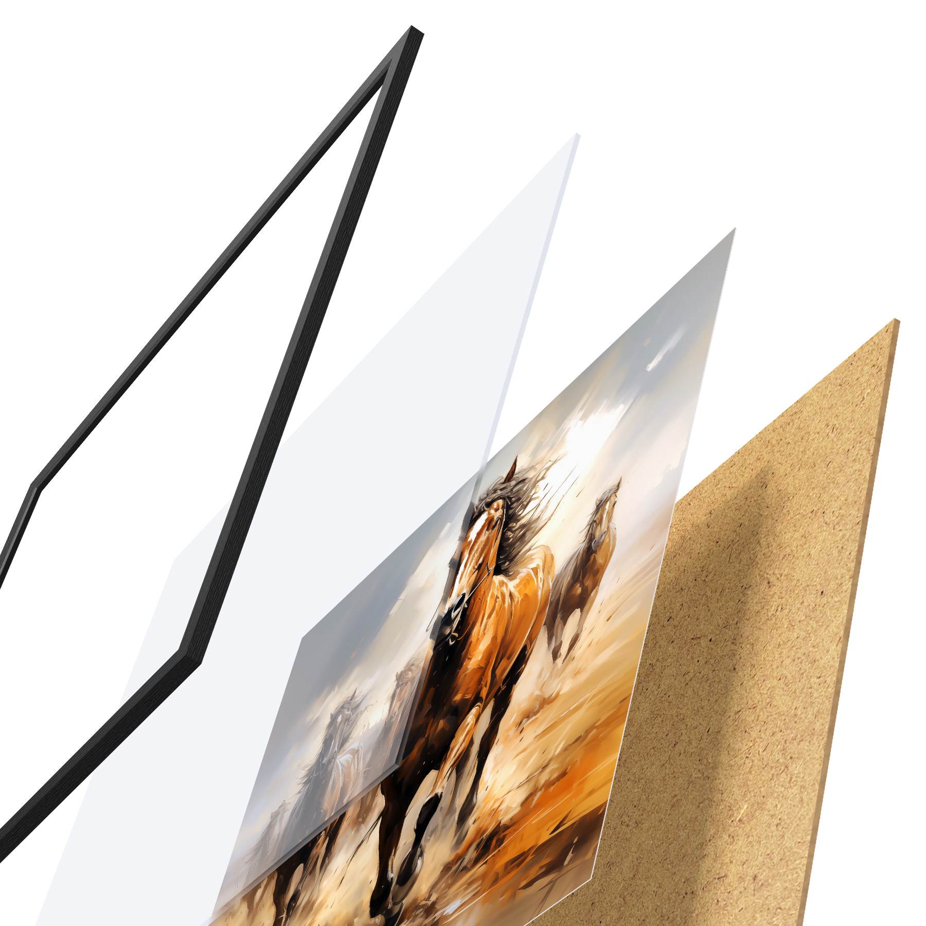 El póster consta de marco, plexiglás, imagen impresa y soporte de aglomerado. El póster puede colgarse inmediatamente en la pared gracias a los soportes de la parte posterior.