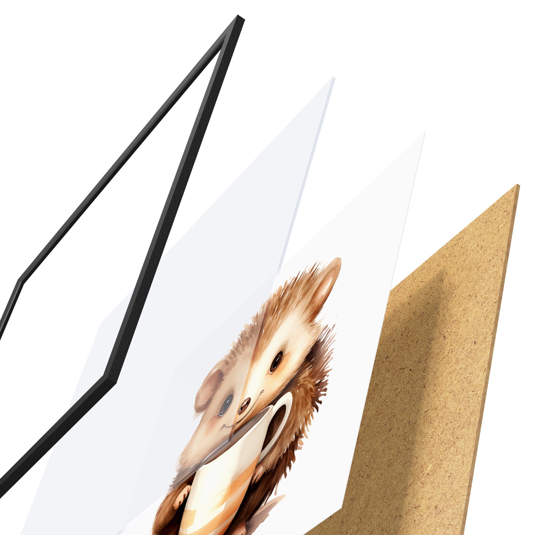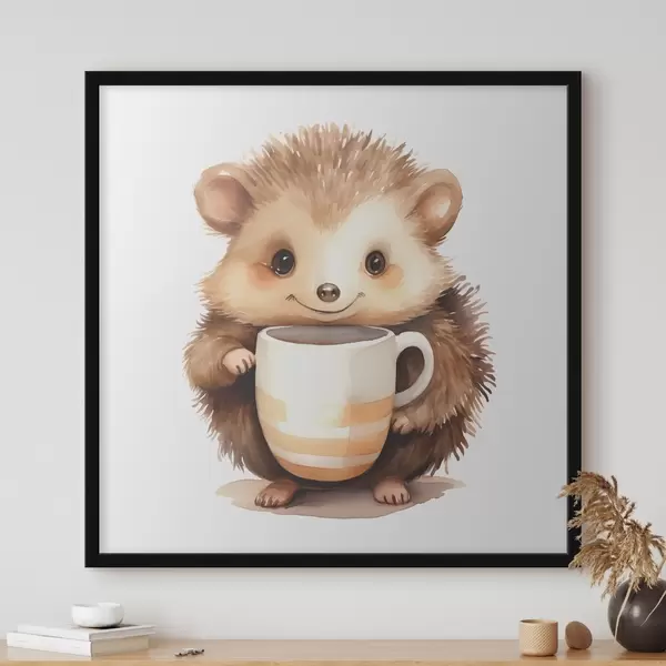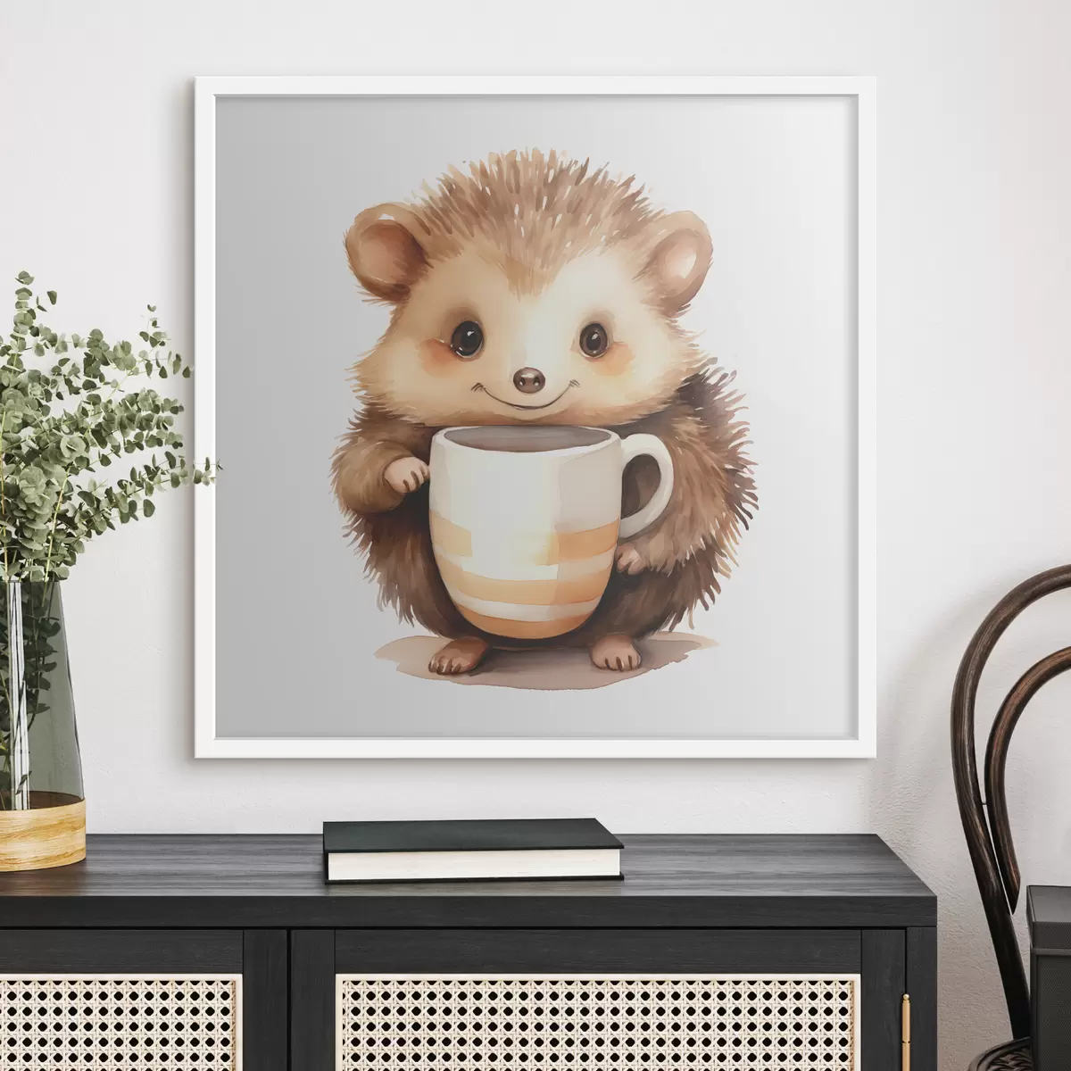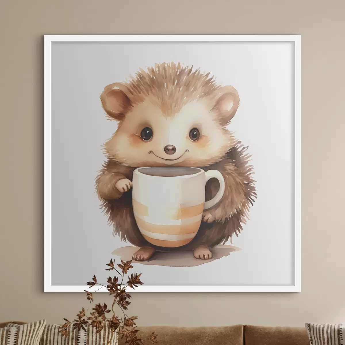 Poster Erizo sosteniendo una taza blanca en sus patas acuarela ilustración para niños f39440