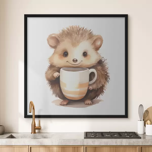 Poster Erizo sosteniendo una taza blanca en sus patas acuarela ilustración para niños Nr f39440