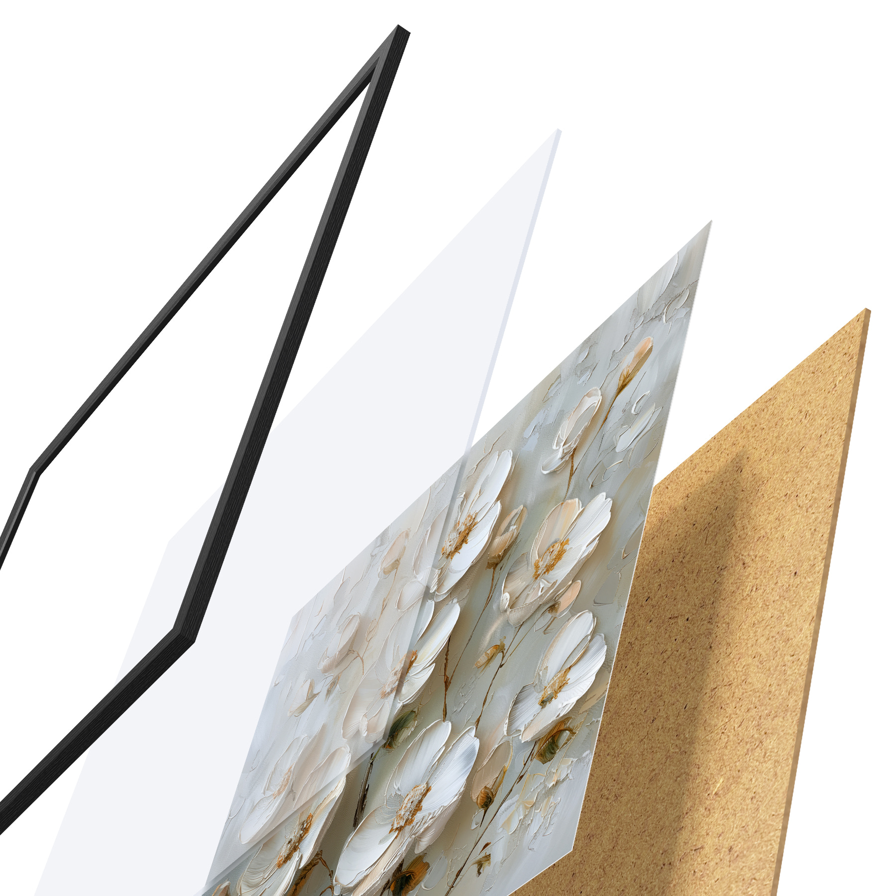 El póster consta de marco, plexiglás, imagen impresa y soporte de aglomerado. El póster puede colgarse inmediatamente en la pared gracias a los soportes de la parte posterior.