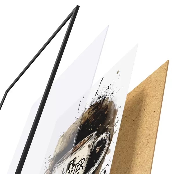 El póster consta de marco, plexiglás, imagen impresa y soporte de aglomerado. El póster puede colgarse inmediatamente en la pared gracias a los soportes de la parte posterior.