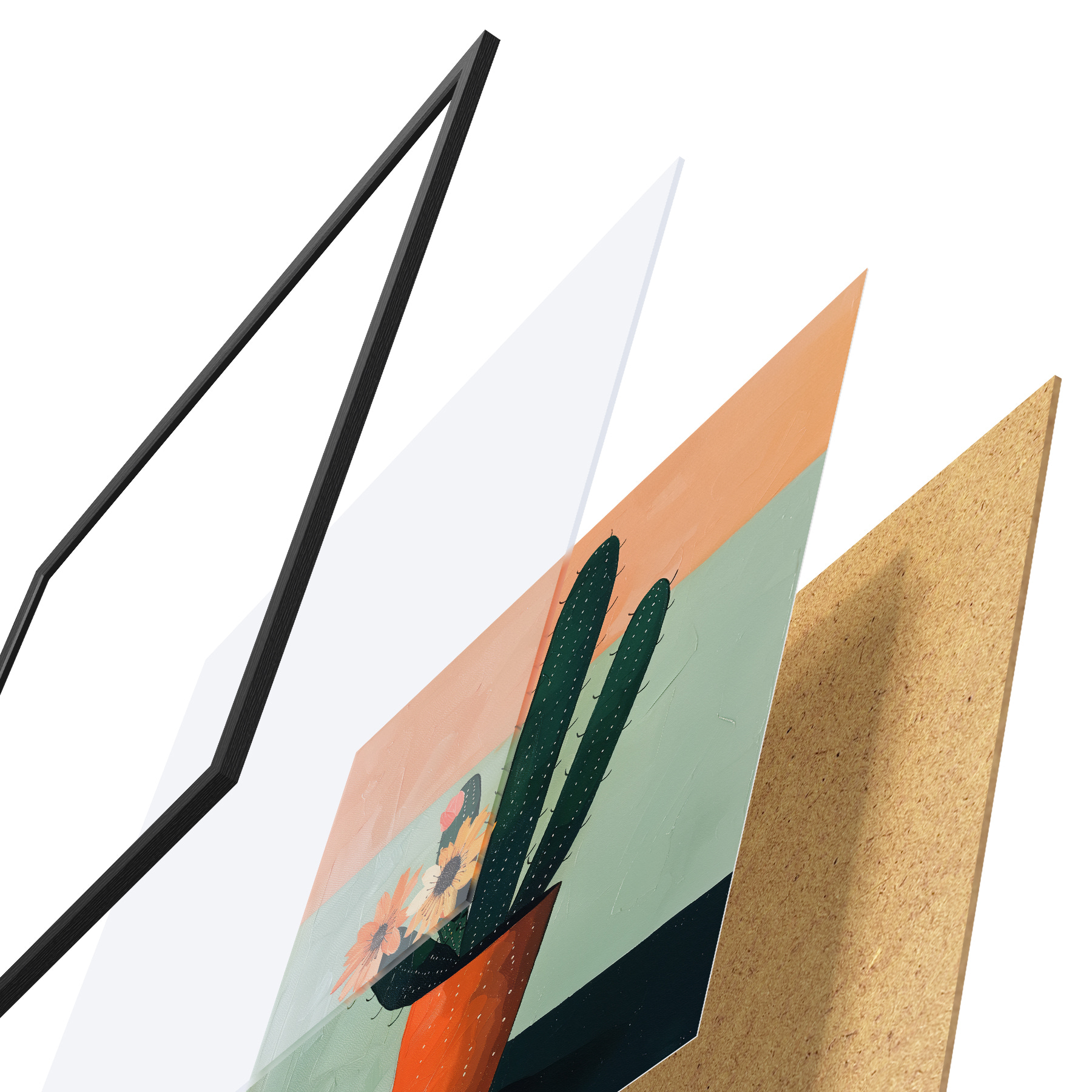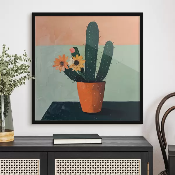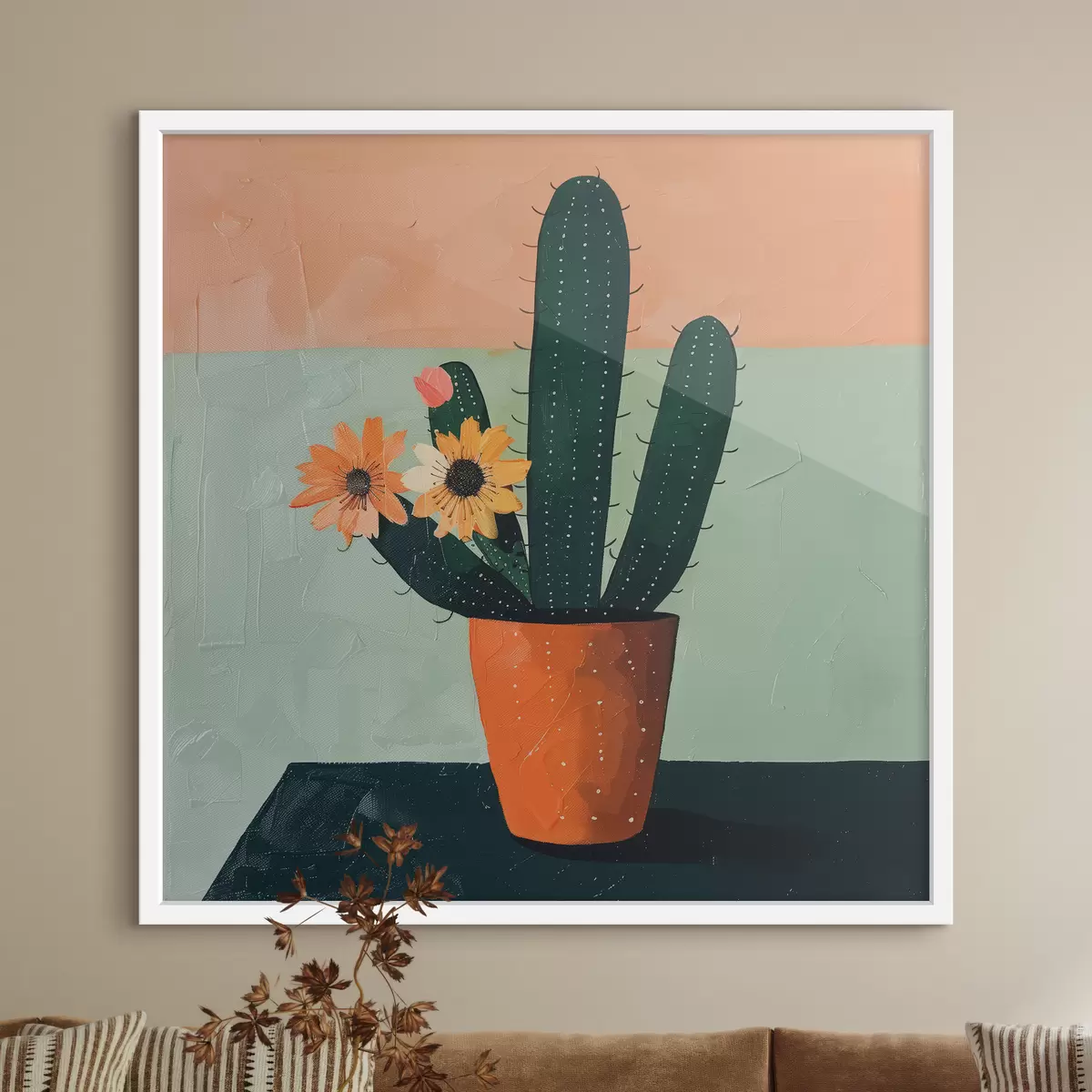 Poster Una pintura minimalista de un solo cactus con flores en una paleta de colores atrevidos. Nr f39452