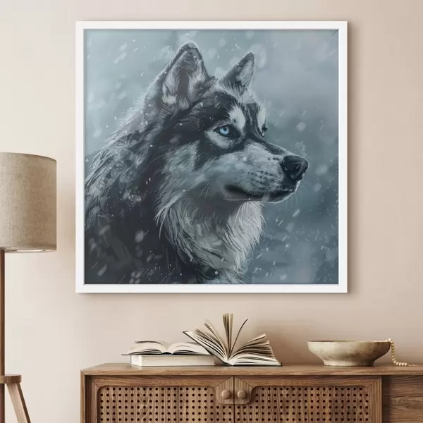Poster Husky con ojos azules sobre fondo azul invernal f39462