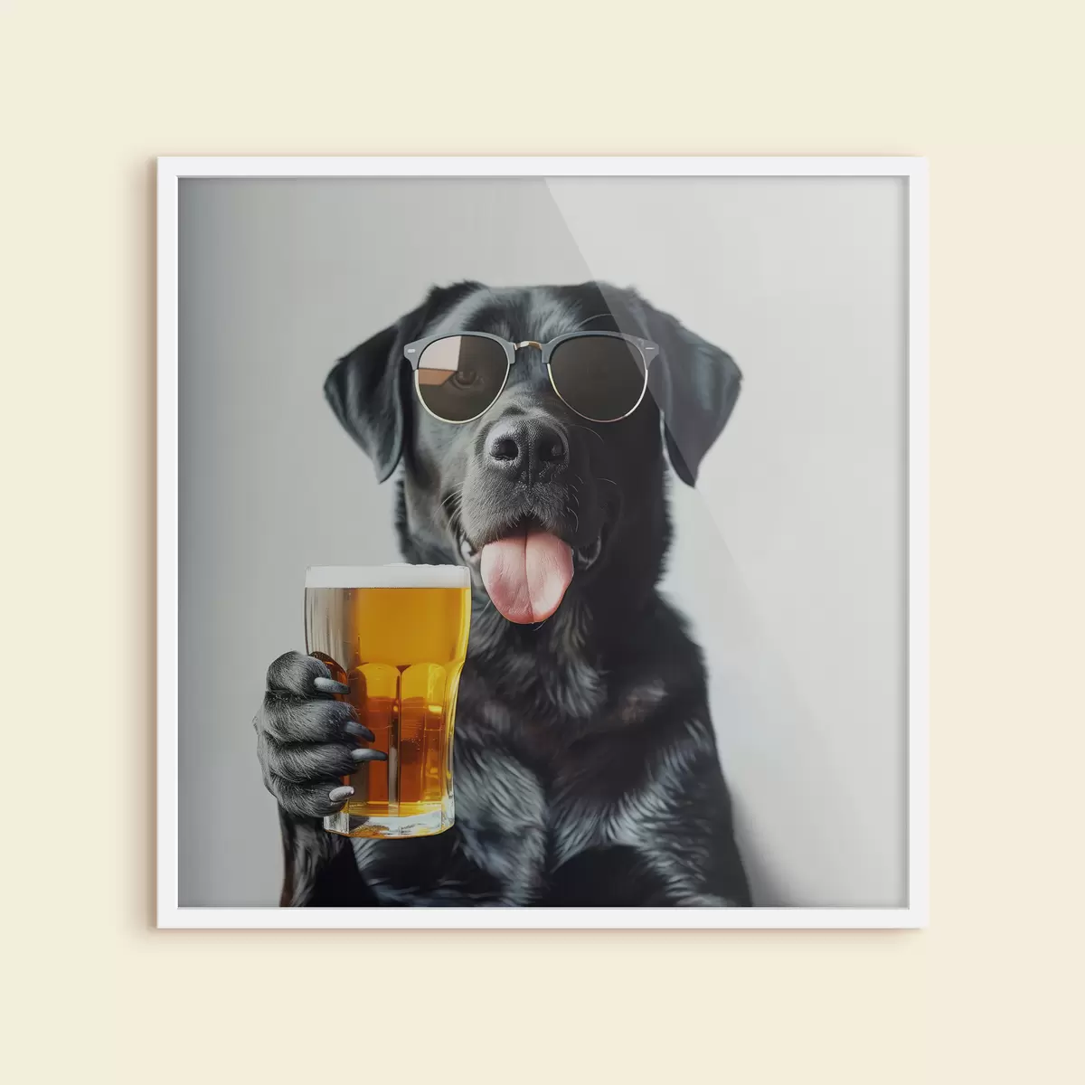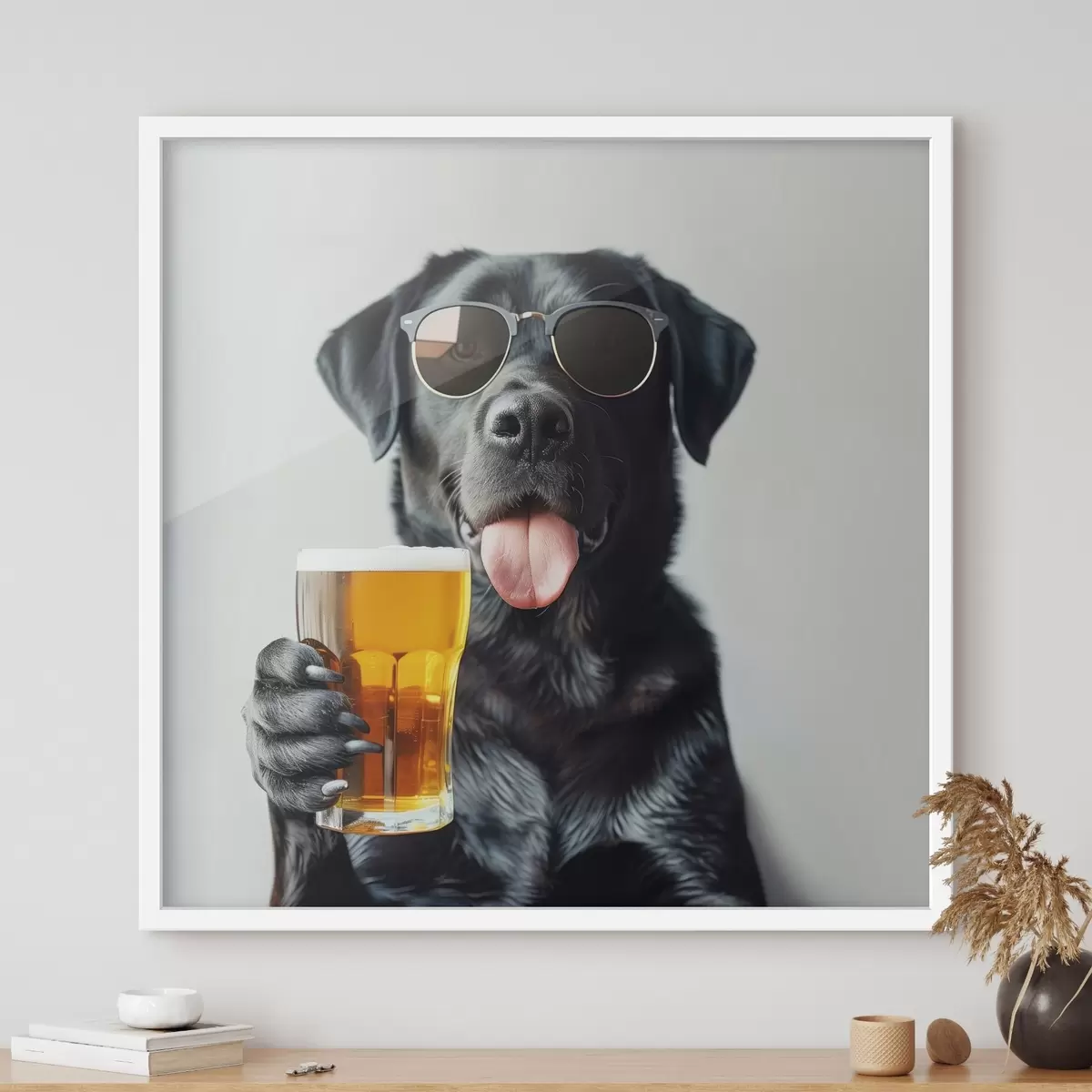 Poster Retrato de un labrador negro con gafas de sol y una jarra de cerveza en la mano, mirando directamente a la cámara Nr f39470
