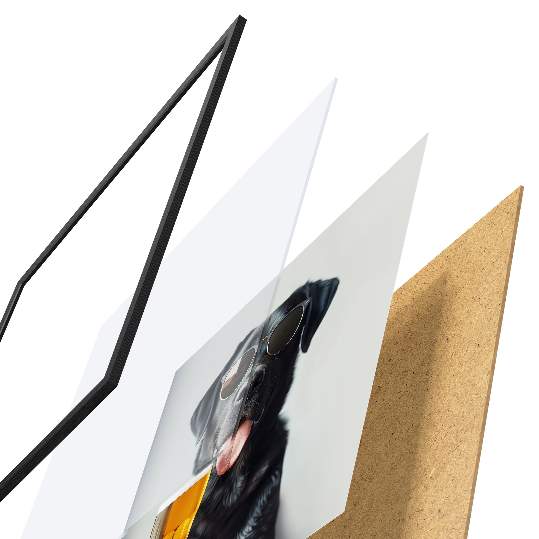 El póster consta de marco, plexiglás, imagen impresa y soporte de aglomerado. El póster puede colgarse inmediatamente en la pared gracias a los soportes de la parte posterior.