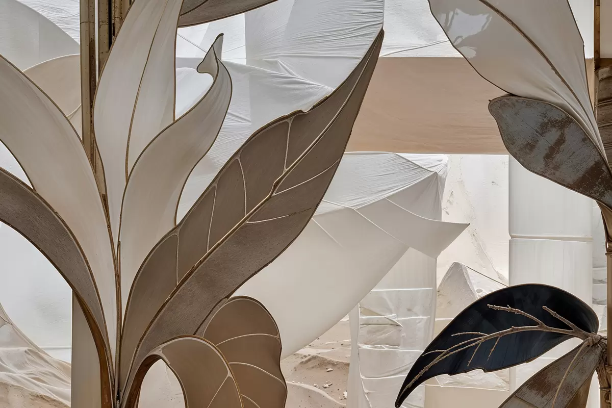 Poster Una vista cercana de un patrón geométrico abstracto con formas y texturas superpuestas en tonos beige f39498