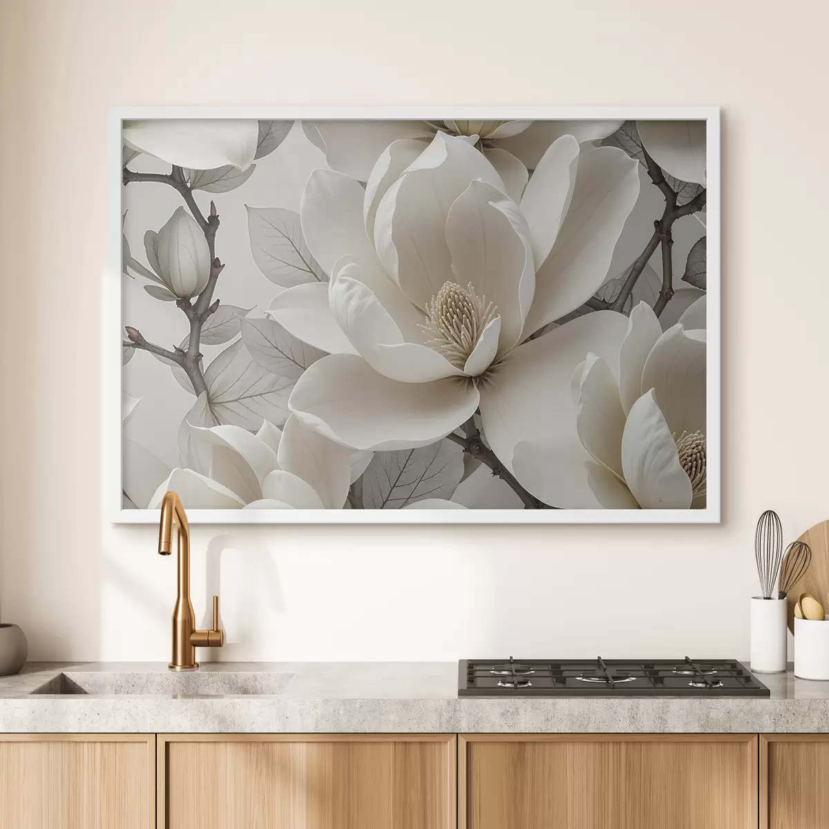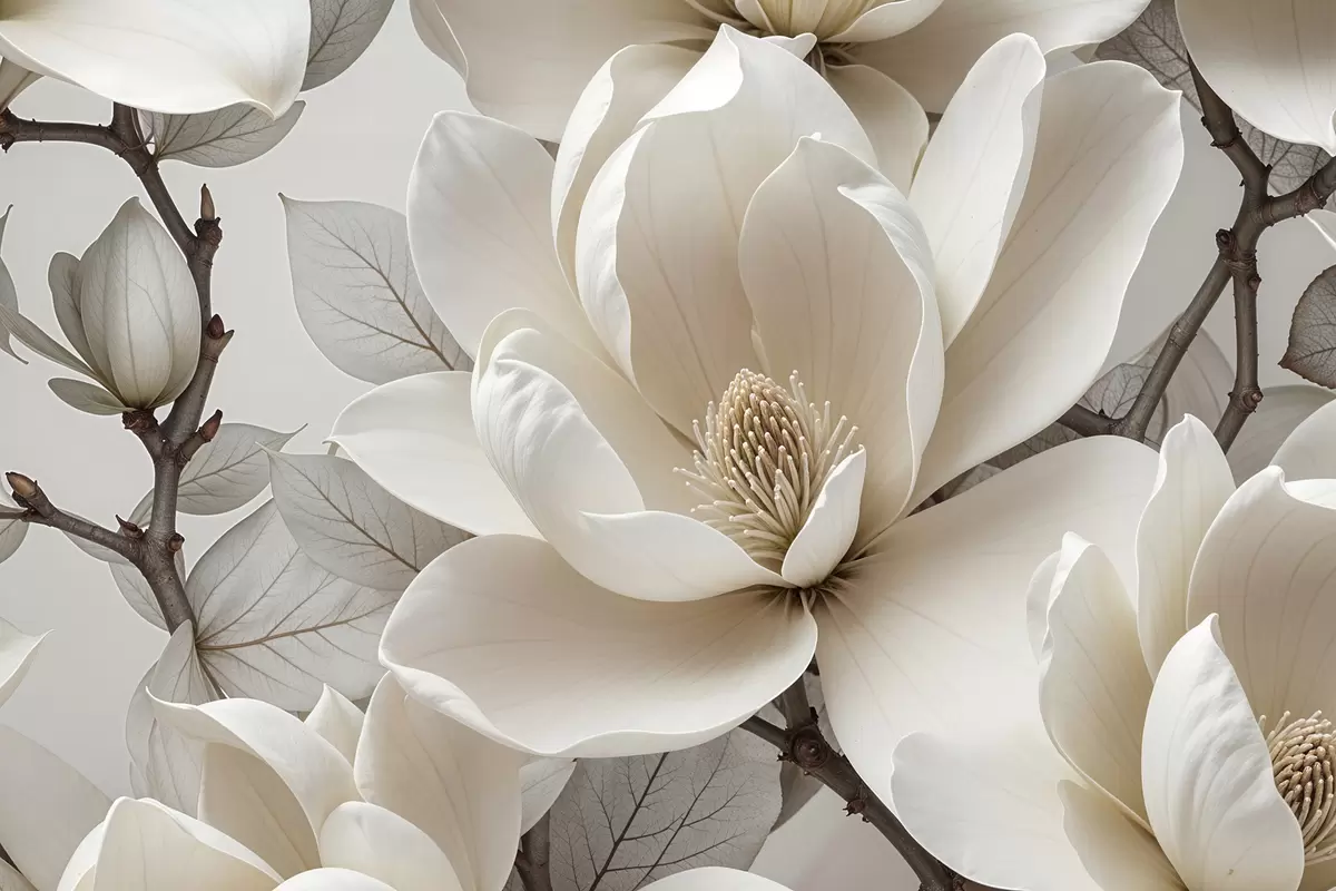 Poster Flor de magnolia blanca con delicados pétalos rodeados de hojas verdes sobre un fondo claro Nr f39527