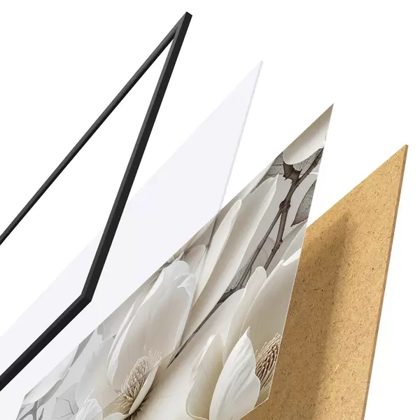 El póster consta de marco, plexiglás, imagen impresa y soporte de aglomerado. El póster puede colgarse inmediatamente en la pared gracias a los soportes de la parte posterior.