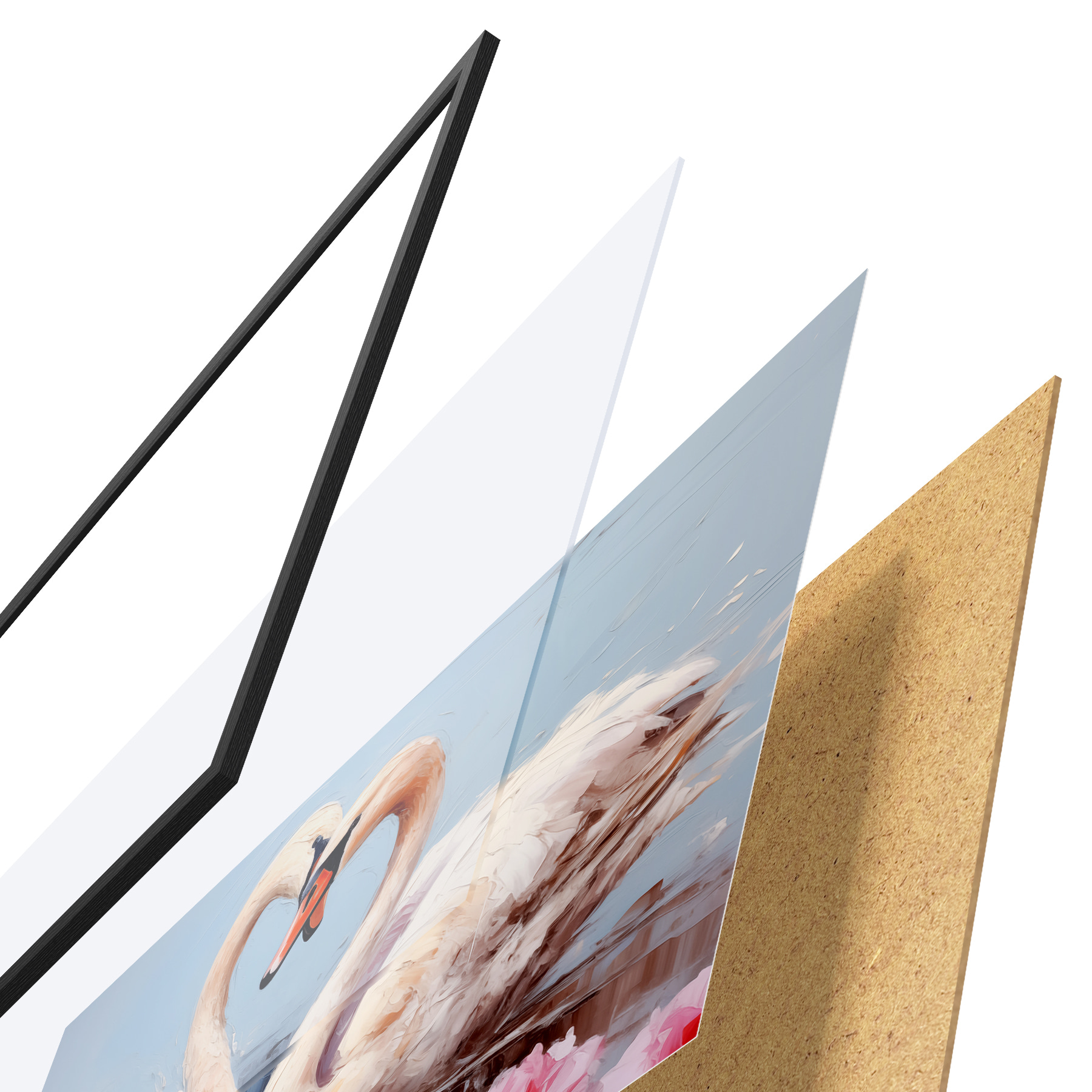El póster consta de marco, plexiglás, imagen impresa y soporte de aglomerado. El póster puede colgarse inmediatamente en la pared gracias a los soportes de la parte posterior.
