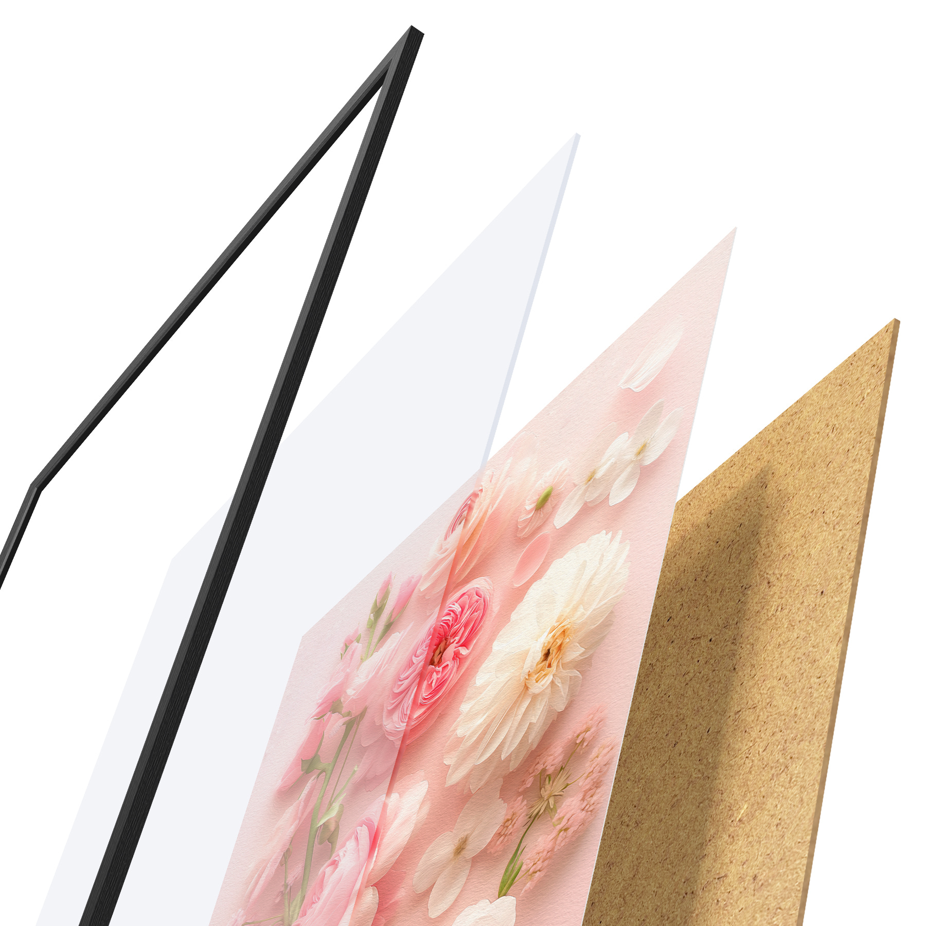 El póster consta de marco, plexiglás, imagen impresa y soporte de aglomerado. El póster puede colgarse inmediatamente en la pared gracias a los soportes de la parte posterior.