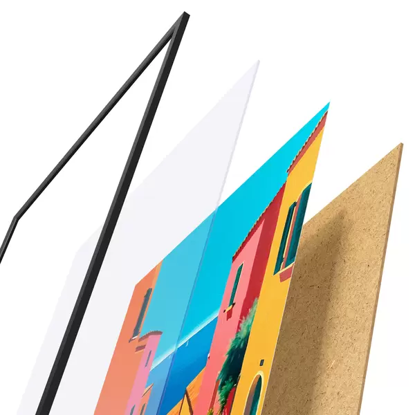 El póster consta de marco, plexiglás, imagen impresa y soporte de aglomerado. El póster puede colgarse inmediatamente en la pared gracias a los soportes de la parte posterior.