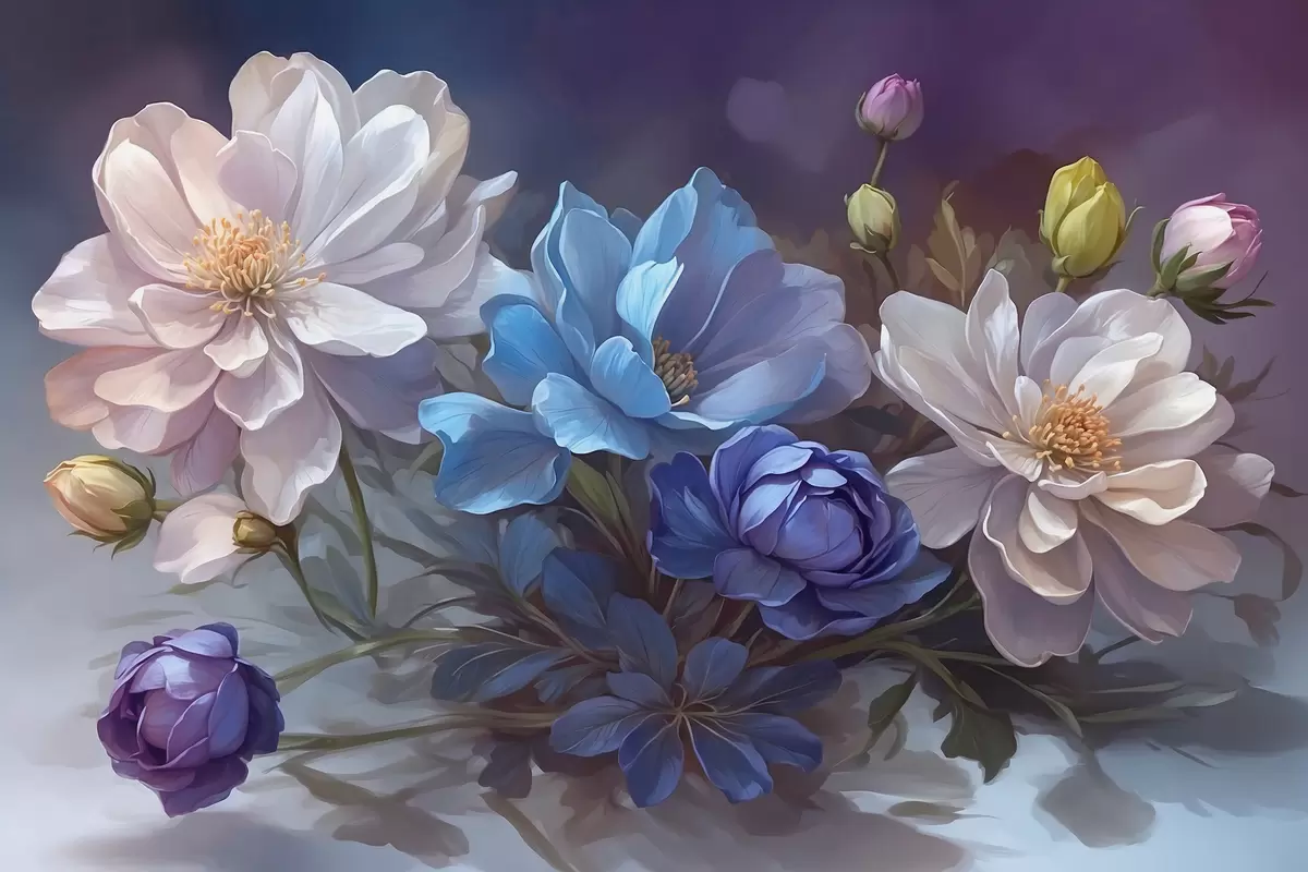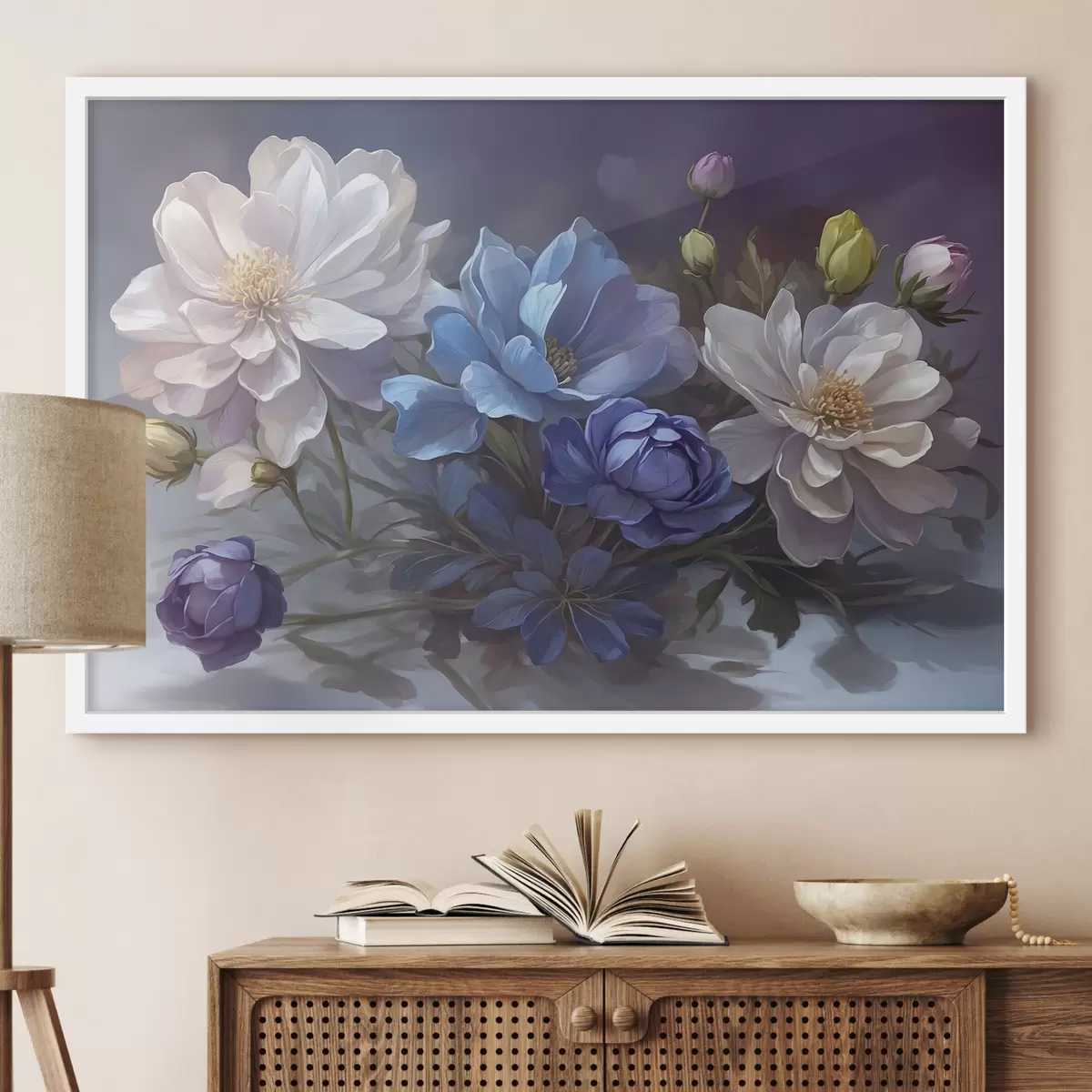 Poster Flores blancas y azules sobre fondo borroso Nr f39603