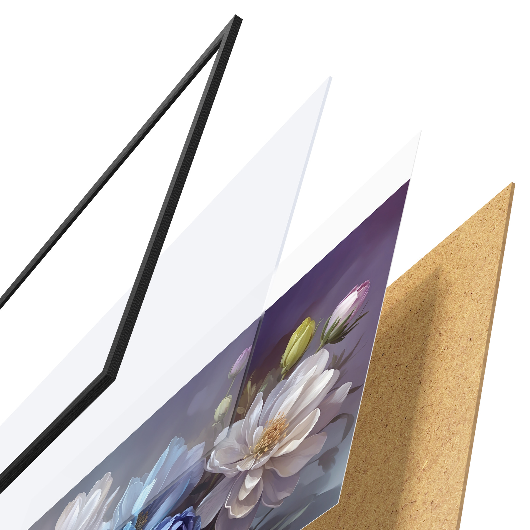 El póster consta de marco, plexiglás, imagen impresa y soporte de aglomerado. El póster puede colgarse inmediatamente en la pared gracias a los soportes de la parte posterior.