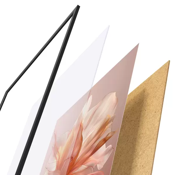 El póster consta de marco, plexiglás, imagen impresa y soporte de aglomerado. El póster puede colgarse inmediatamente en la pared gracias a los soportes de la parte posterior.