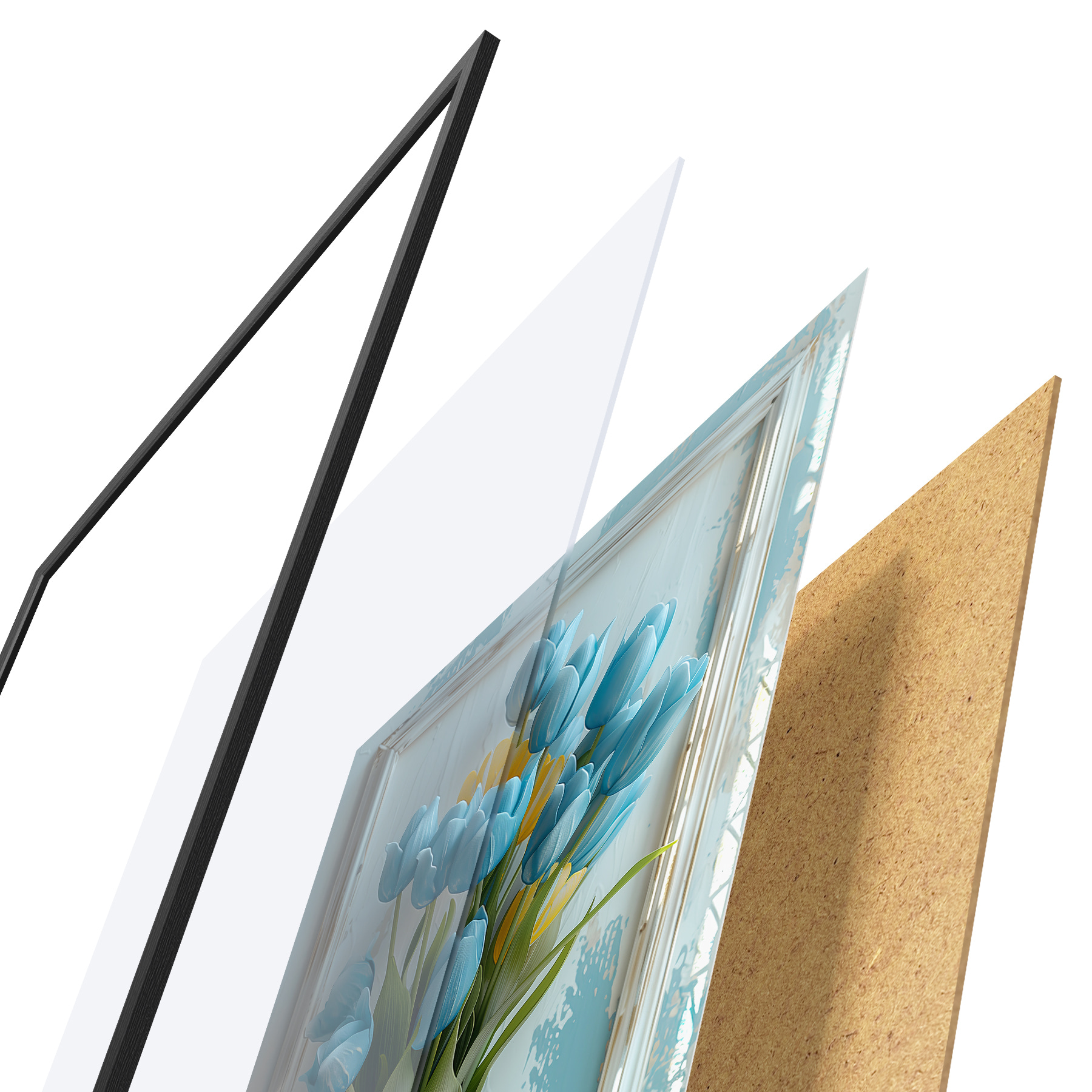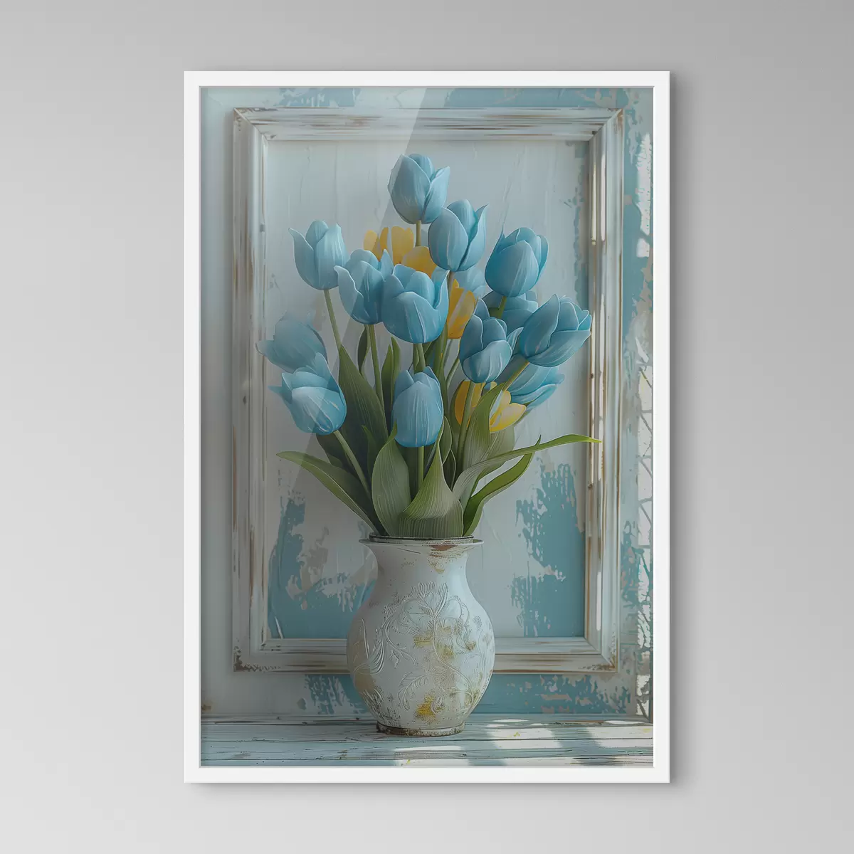 Poster Tulipanes azules y amarillos en 3D: elegante cuadro de pared con marco blanco, fondo blanco y azul claro y jarrón grabado Nr f39636