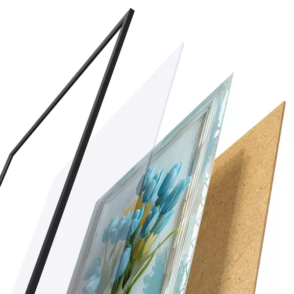 El póster consta de marco, plexiglás, imagen impresa y soporte de aglomerado. El póster puede colgarse inmediatamente en la pared gracias a los soportes de la parte posterior.