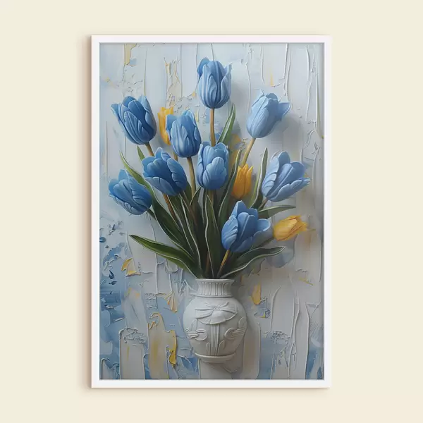 Poster Tulipanes azules y amarillos en 3D: elegante cuadro pintado al óleo con fondo blanco y azul claro y jarrón grabado f39637
