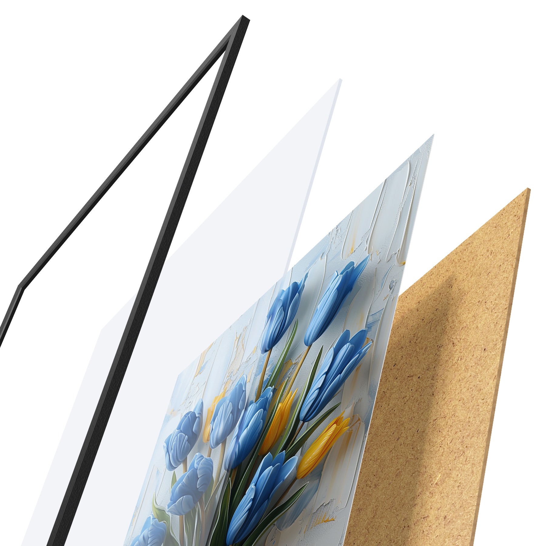 Poster Tulipanes azules y amarillos en 3D: elegante cuadro pintado al óleo con fondo blanco y azul claro y jarrón grabado Nr f39637