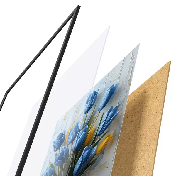 El póster consta de marco, plexiglás, imagen impresa y soporte de aglomerado. El póster puede colgarse inmediatamente en la pared gracias a los soportes de la parte posterior.