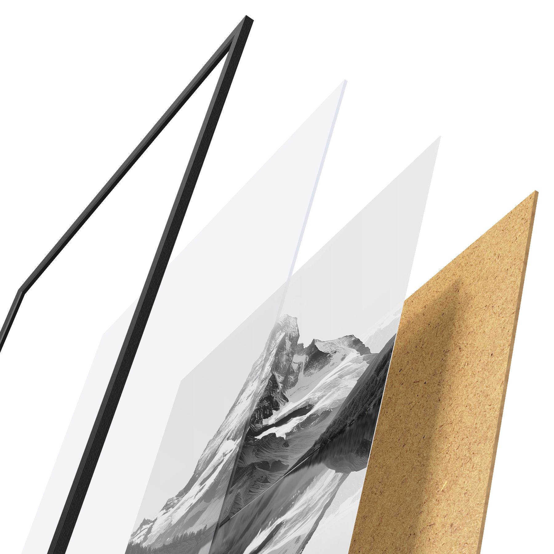 El póster consta de marco, plexiglás, imagen impresa y soporte de aglomerado. El póster puede colgarse inmediatamente en la pared gracias a los soportes de la parte posterior.