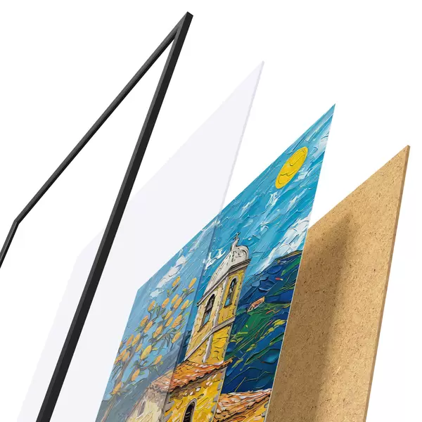 El póster consta de marco, plexiglás, imagen impresa y soporte de aglomerado. El póster puede colgarse inmediatamente en la pared gracias a los soportes de la parte posterior.