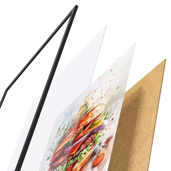 El póster consta de marco, plexiglás, imagen impresa y soporte de aglomerado. El póster puede colgarse inmediatamente en la pared gracias a los soportes de la parte posterior.