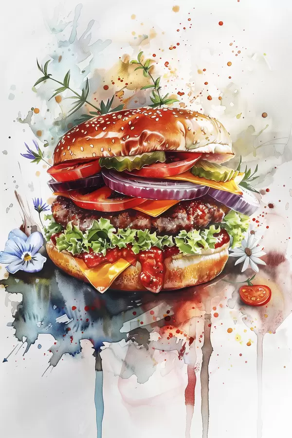 Poster Sabrosa hamburguesa con carne, floral, acuarela, arte gastronómico. f39699
