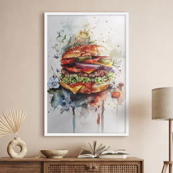Poster Sabrosa hamburguesa con carne, floral, acuarela, arte gastronómico. Nr f39699