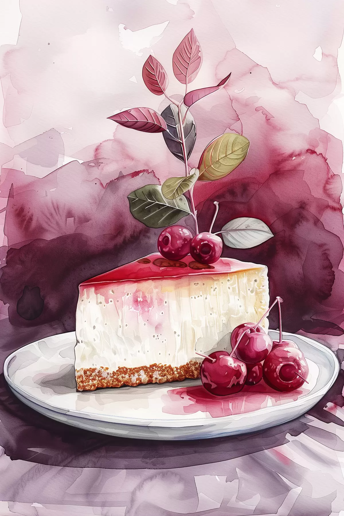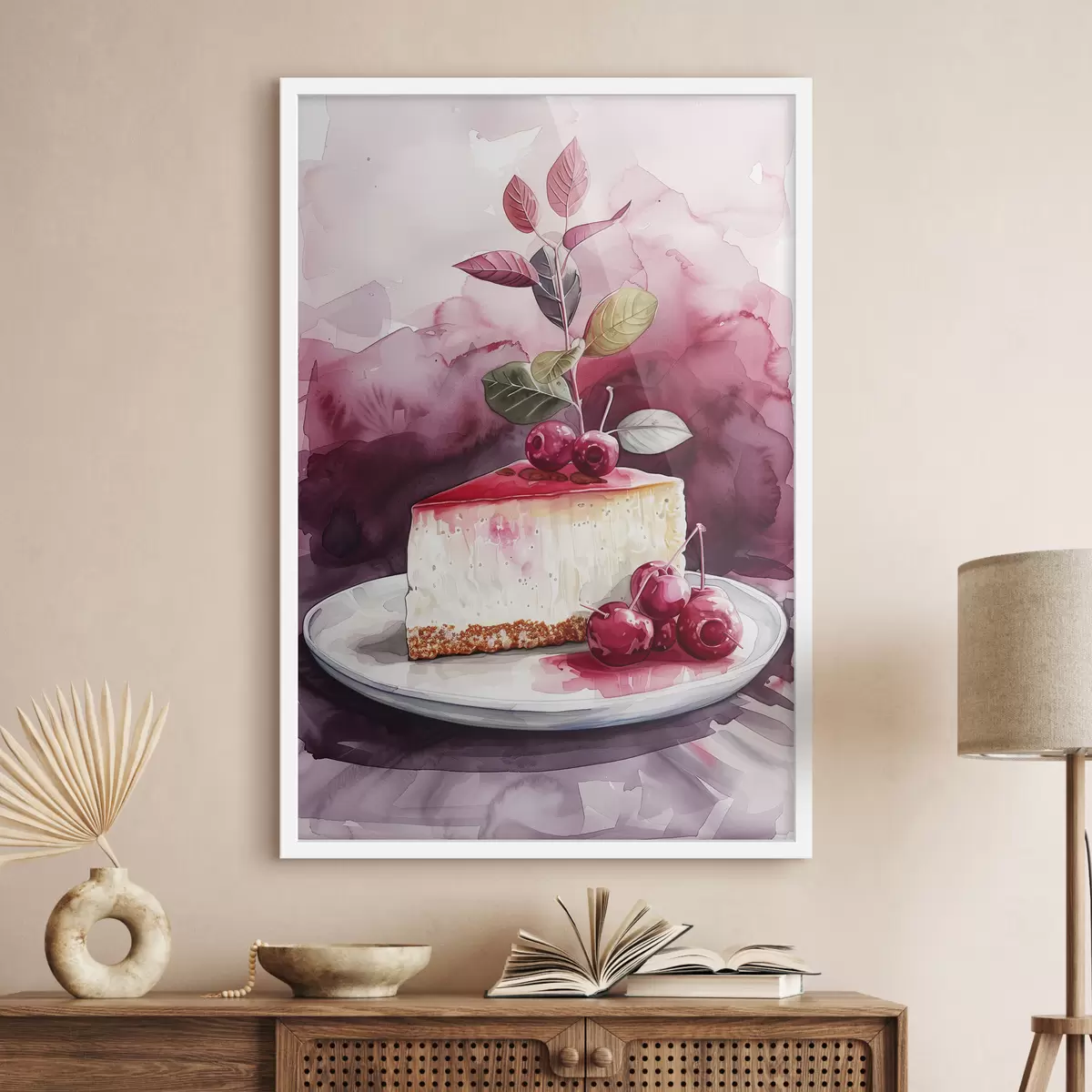 Poster Tarta de queso acuarela con cerezas, arte gastronómico elegante, colores rojo y morado Nr f39700