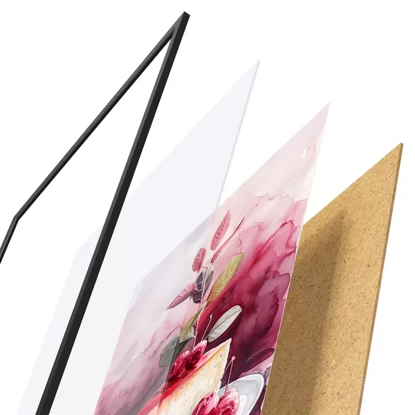 El póster consta de marco, plexiglás, imagen impresa y soporte de aglomerado. El póster puede colgarse inmediatamente en la pared gracias a los soportes de la parte posterior.