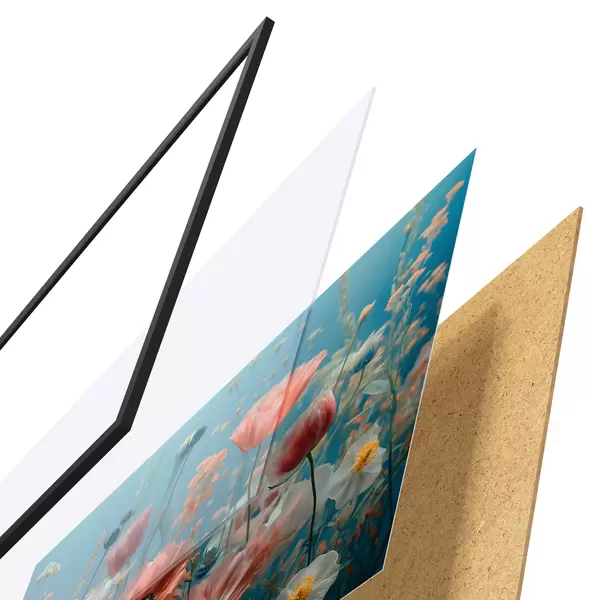 El póster consta de marco, plexiglás, imagen impresa y soporte de aglomerado. El póster puede colgarse inmediatamente en la pared gracias a los soportes de la parte posterior.