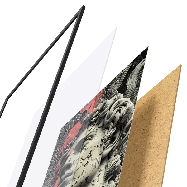 El póster consta de marco, plexiglás, imagen impresa y soporte de aglomerado. El póster puede colgarse inmediatamente en la pared gracias a los soportes de la parte posterior.