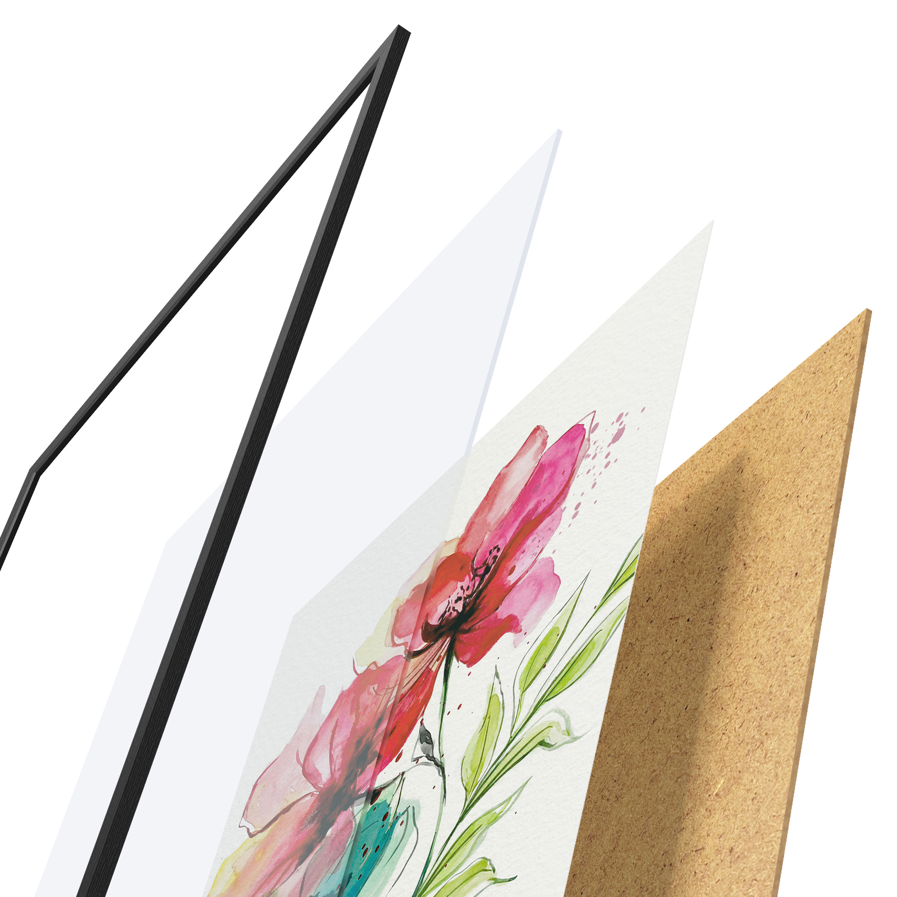 El póster consta de marco, plexiglás, imagen impresa y soporte de aglomerado. El póster puede colgarse inmediatamente en la pared gracias a los soportes de la parte posterior.