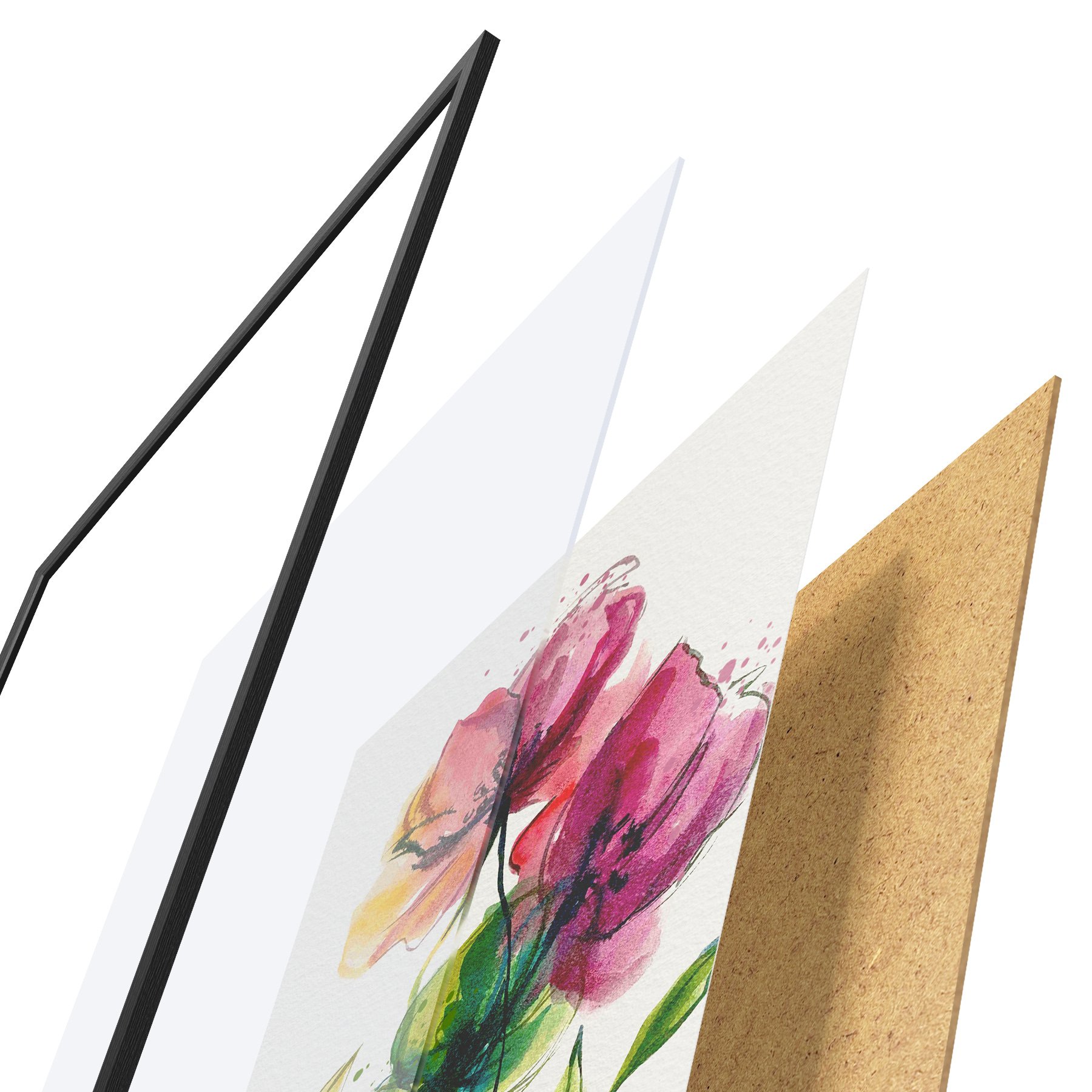 El póster consta de marco, plexiglás, imagen impresa y soporte de aglomerado. El póster puede colgarse inmediatamente en la pared gracias a los soportes de la parte posterior.