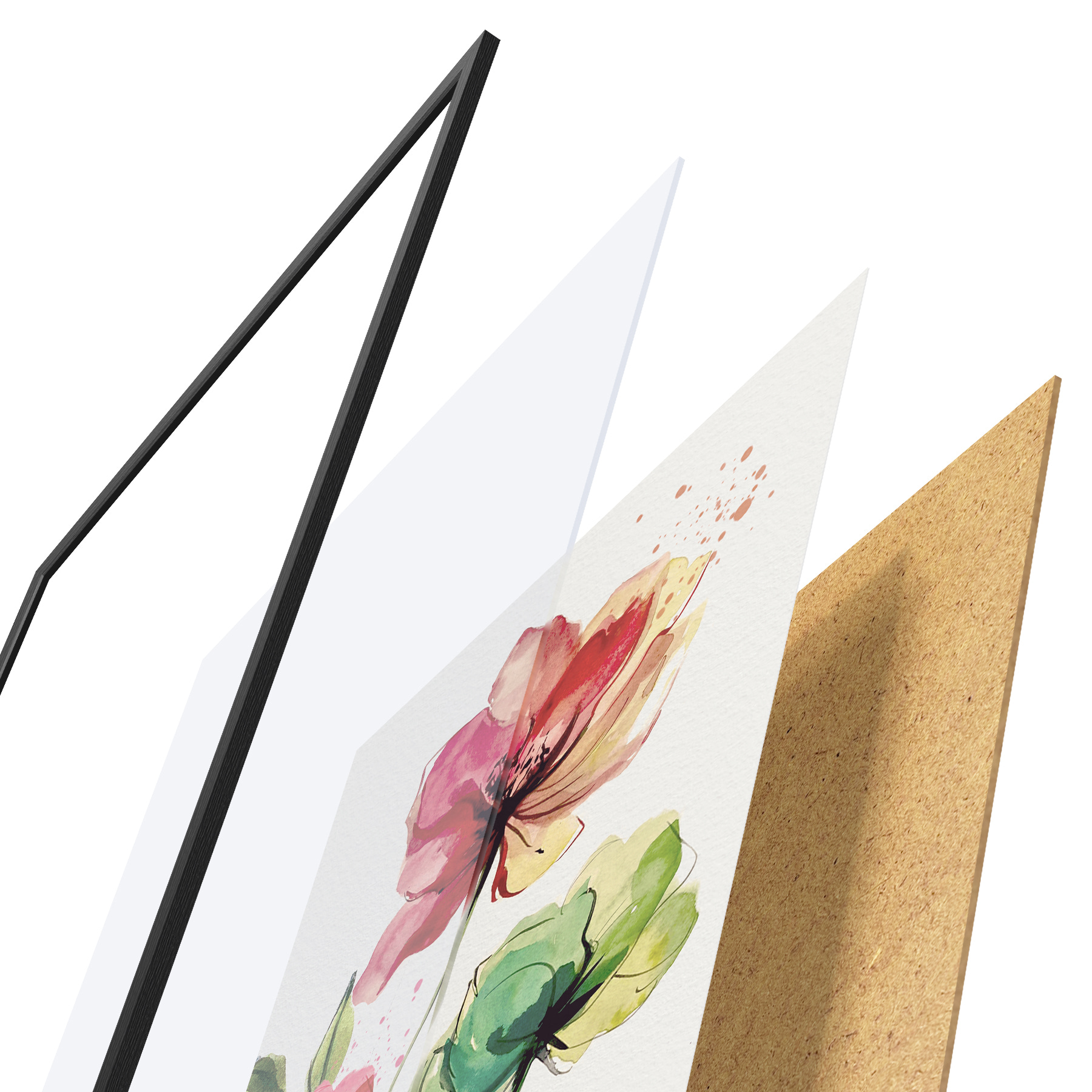 El póster consta de marco, plexiglás, imagen impresa y soporte de aglomerado. El póster puede colgarse inmediatamente en la pared gracias a los soportes de la parte posterior.