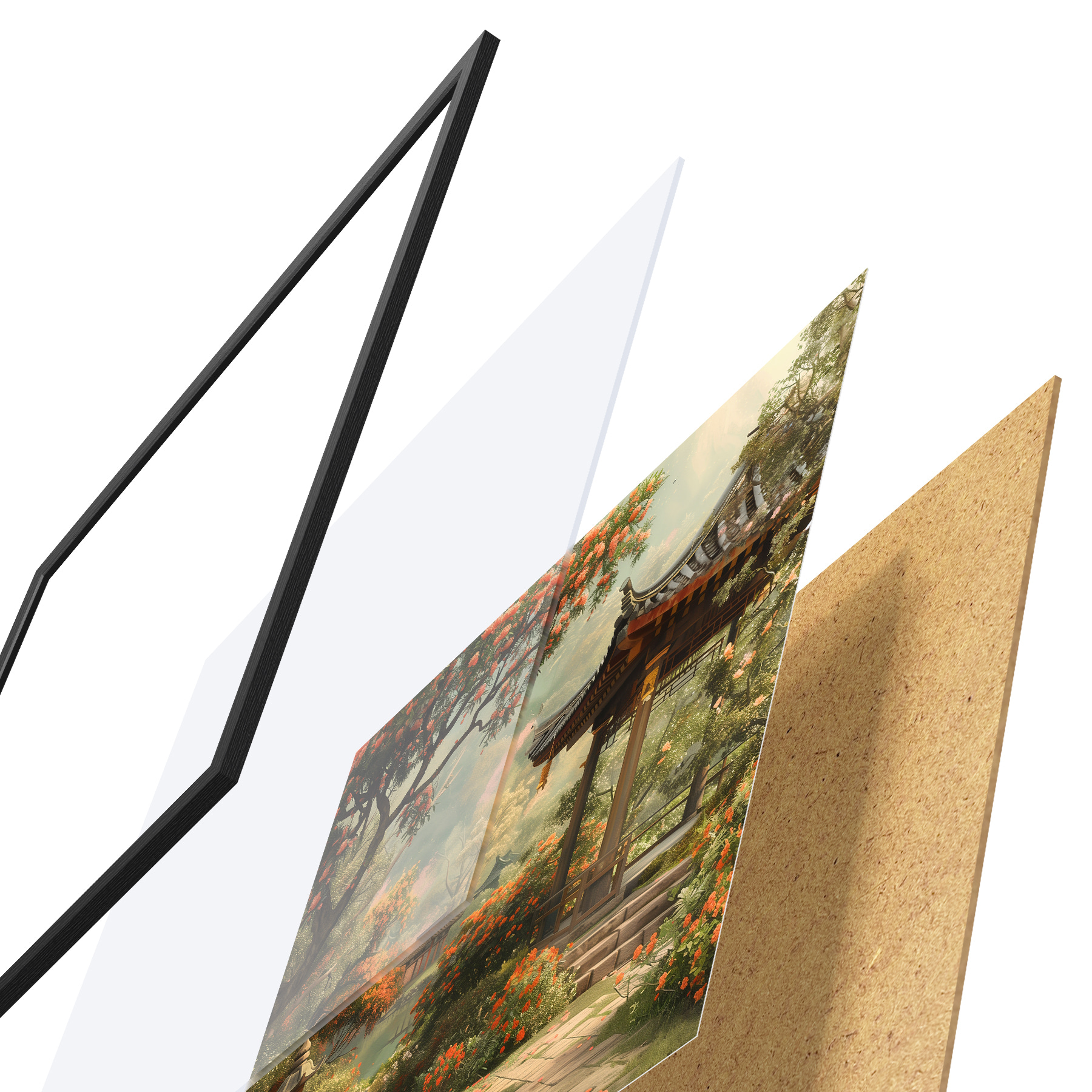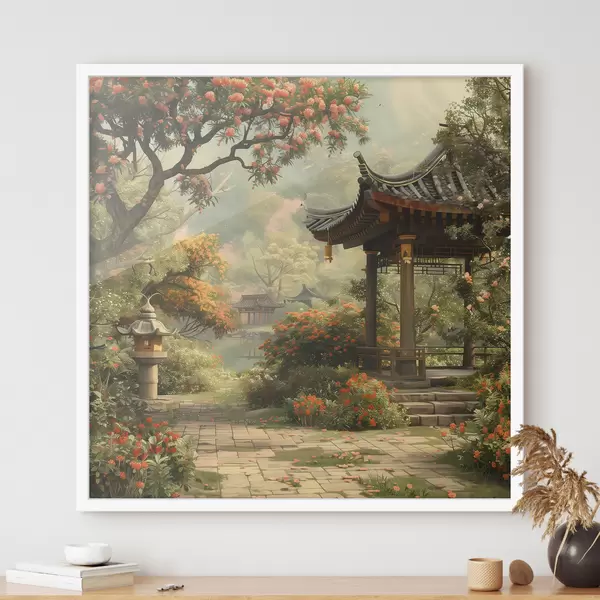 Poster Parque japonés con árboles y flores en flor, bosque, casa de jardín, lago Nr f39772
