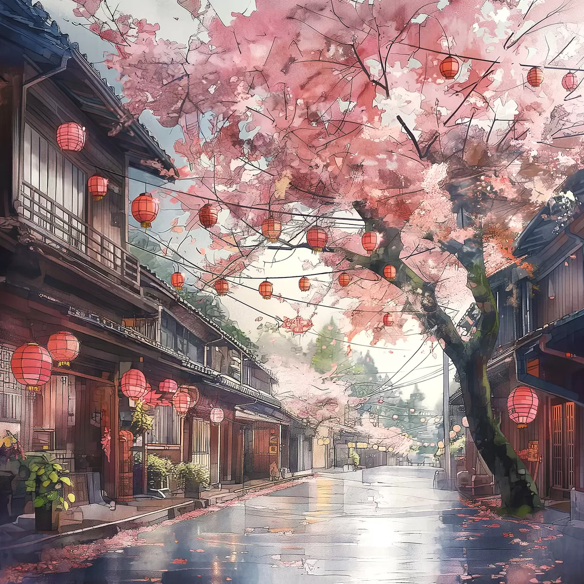 Poster Calle japonesa con cerezos en flor, arquitectura oriental, linternas f39774