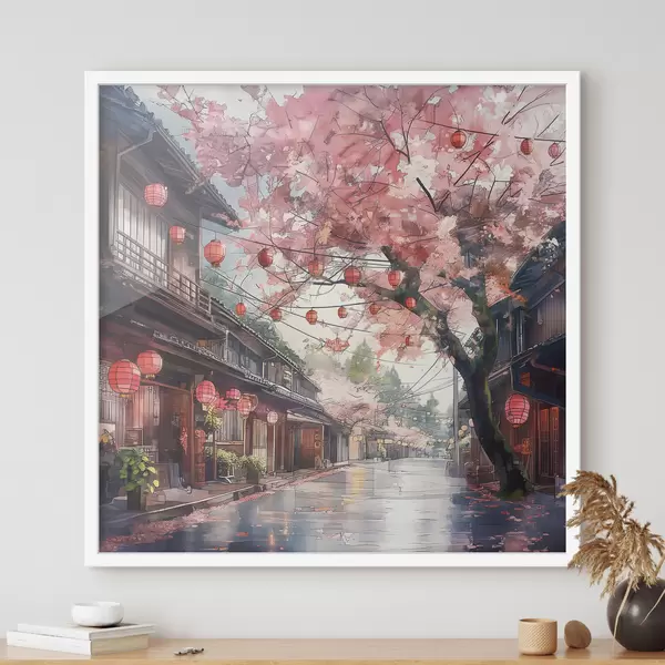 Poster Calle japonesa con cerezos en flor, arquitectura oriental, linternas Nr f39774