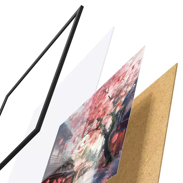 El póster consta de marco, plexiglás, imagen impresa y soporte de aglomerado. El póster puede colgarse inmediatamente en la pared gracias a los soportes de la parte posterior.